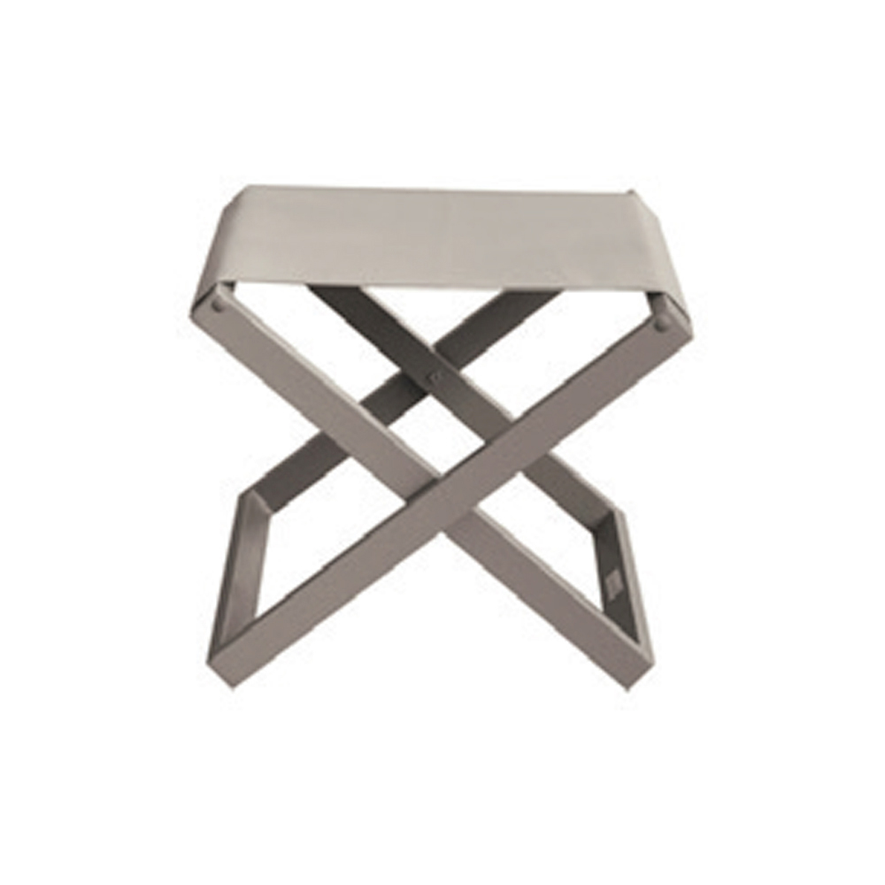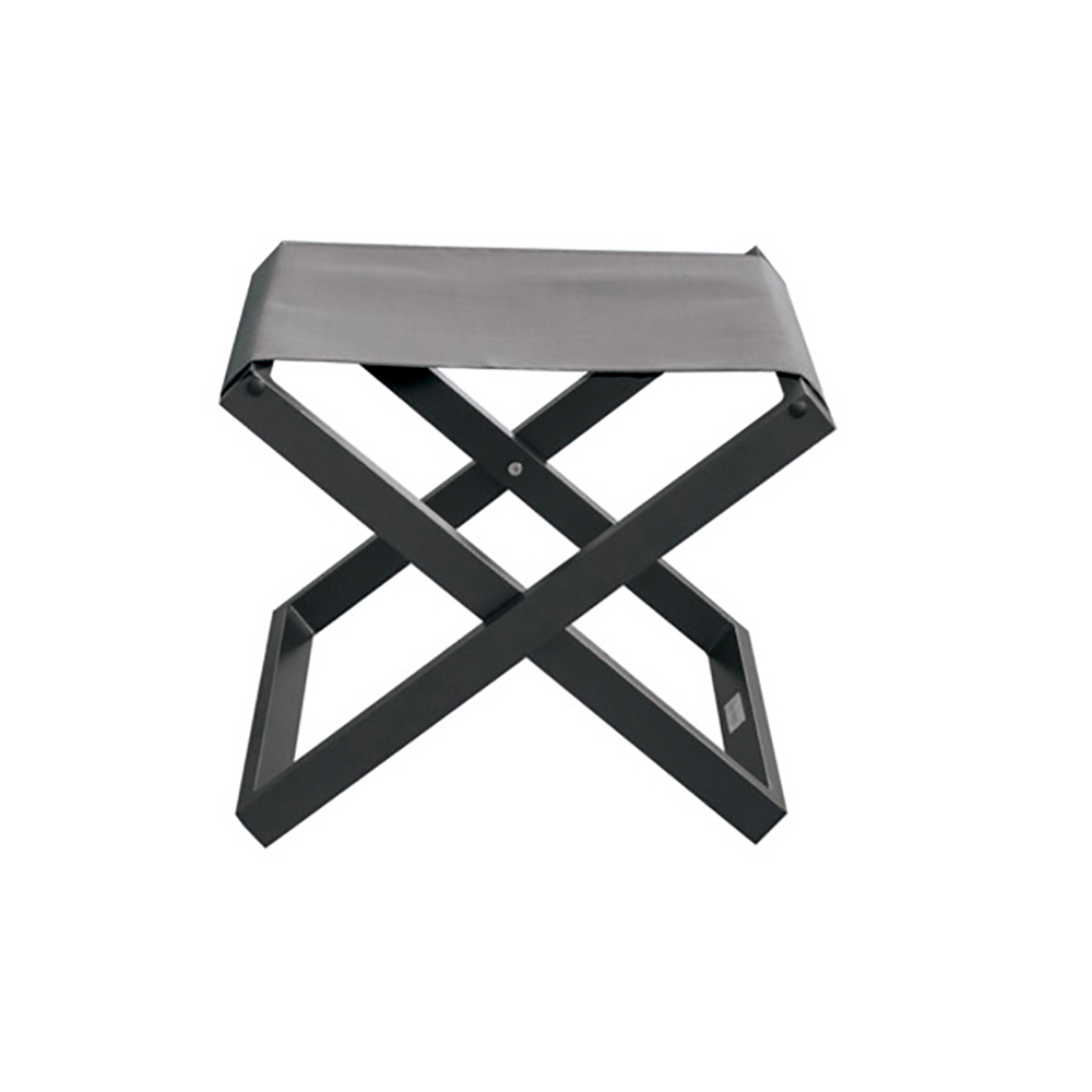 Nízká stolička pro venkovní použití s konstrukcí z hliníku a textilu s práškovým nástřikem.
