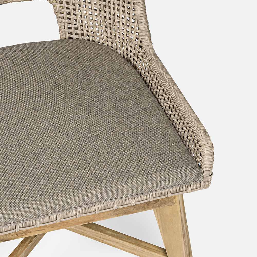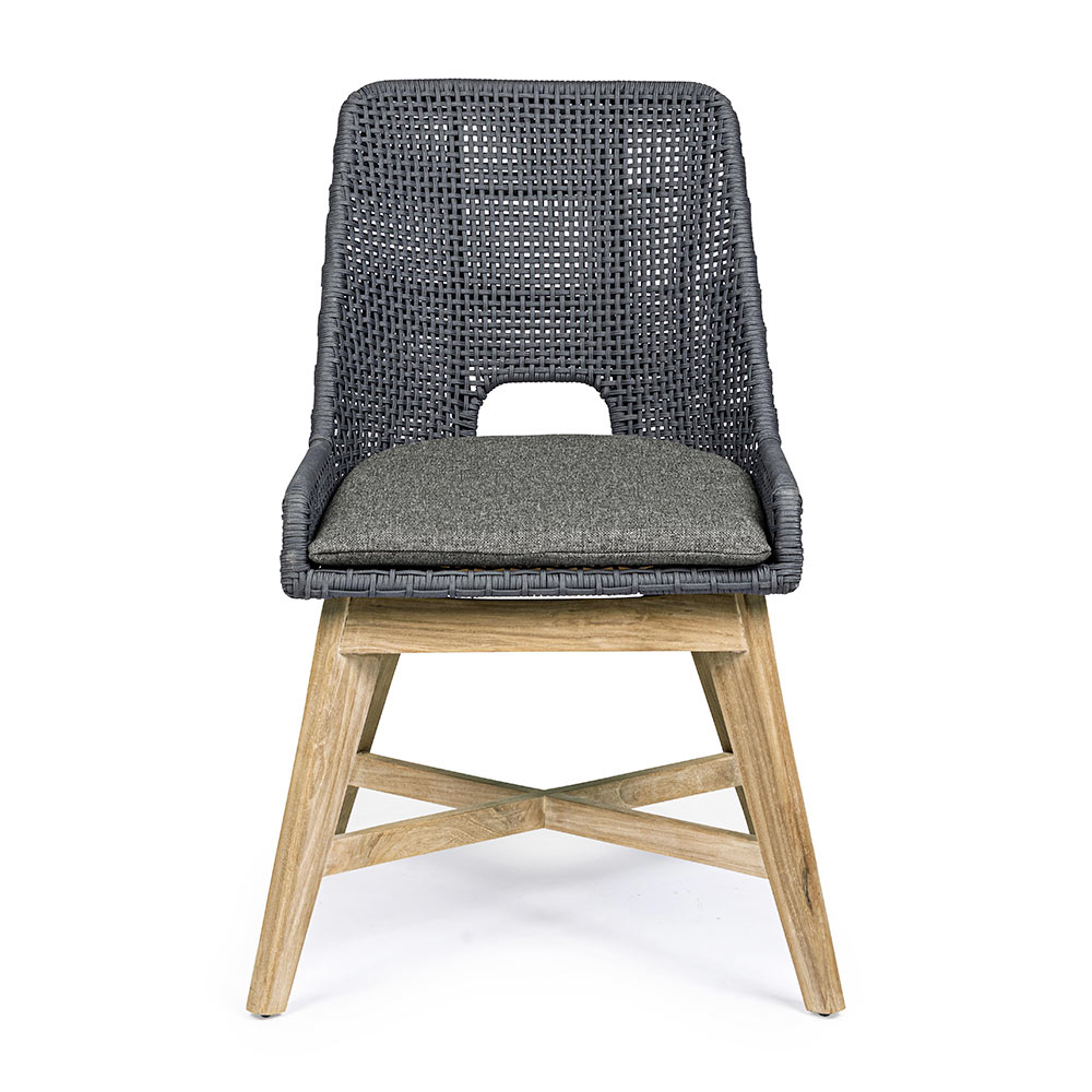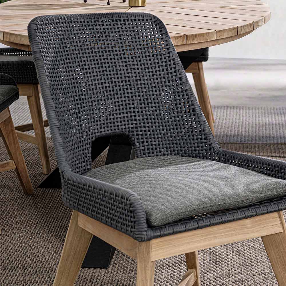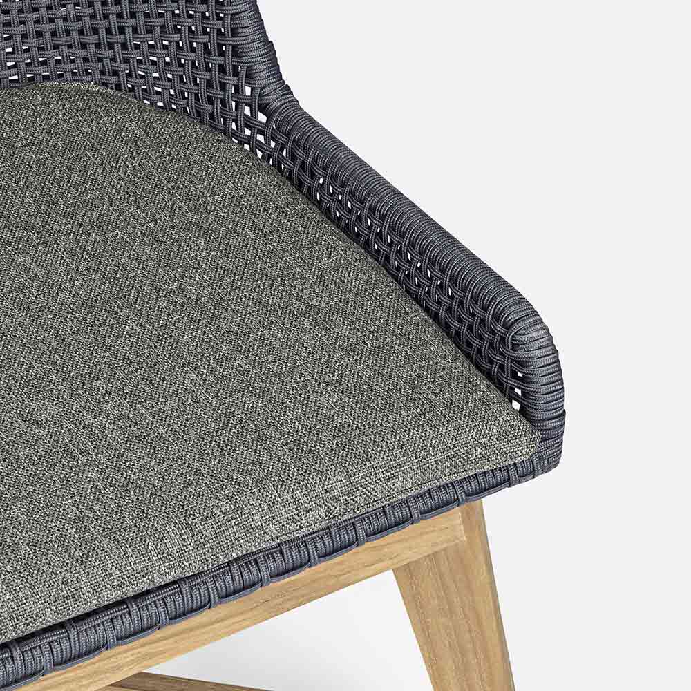 Venkovní židle s nohami z teakového dřeva a lanovým a látkovým sedákem, 2 kusy.
