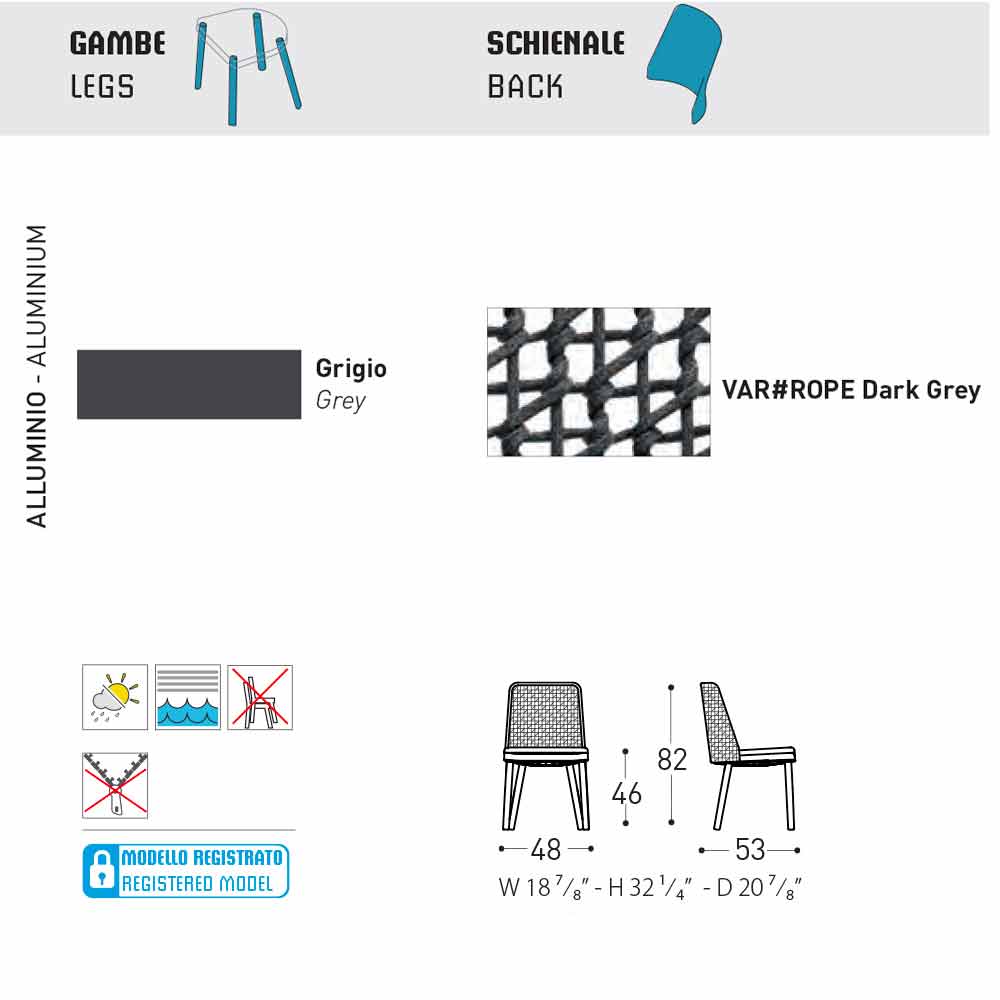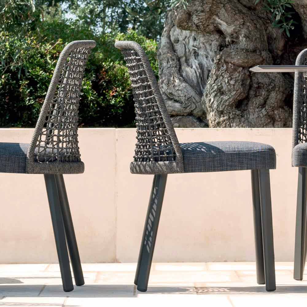 Emma je zahradní židle charakterizované strukturou z ručně tkaného syntetického vlákna s tmavě šedým hliníkovým rámem potaženým práškovou barvou .