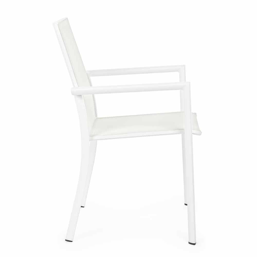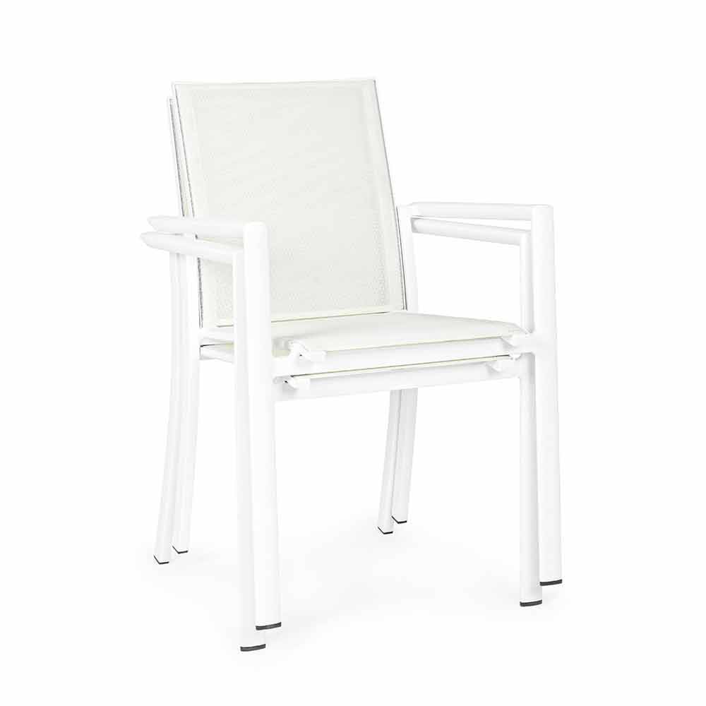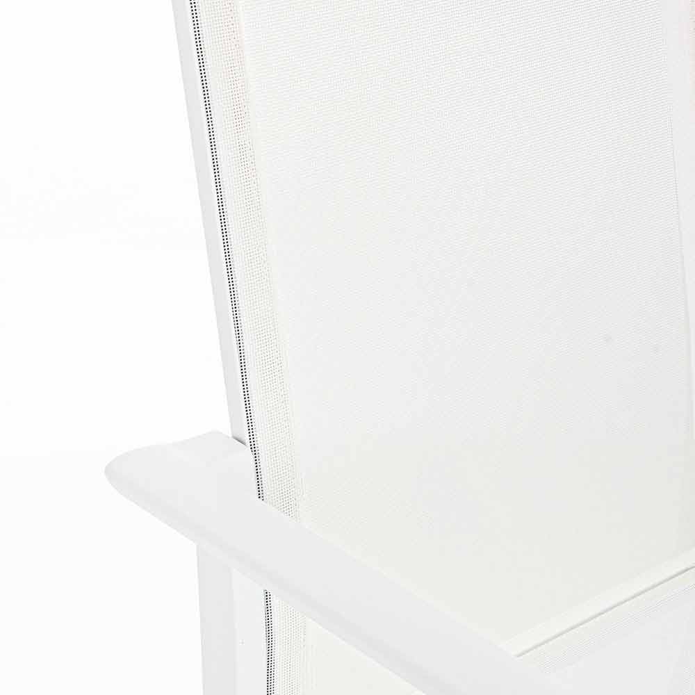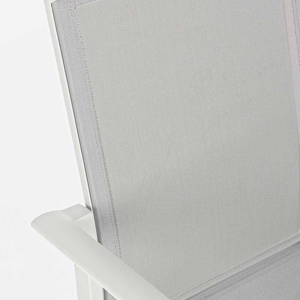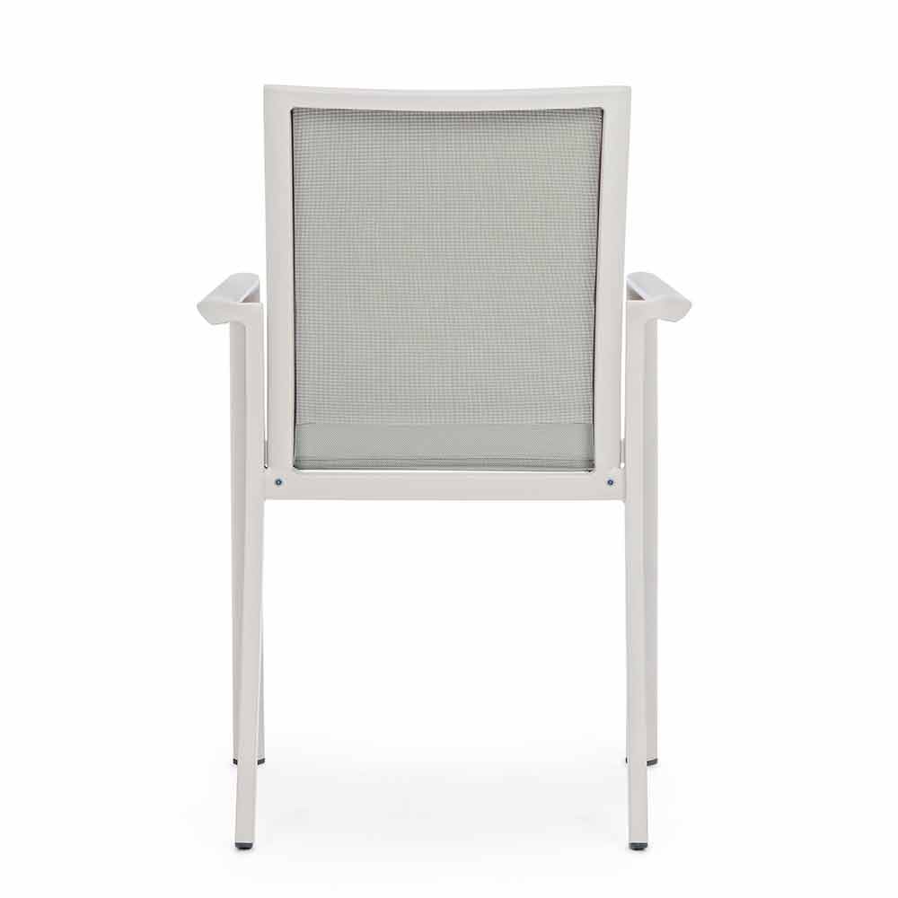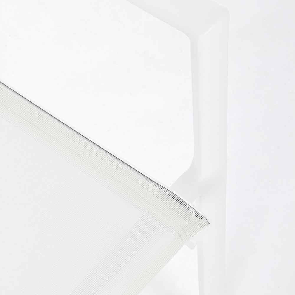 Moderní designová stohovatelná venkovní židle v rastrovém nebo bílém hliníkovém a textilním sedadle.