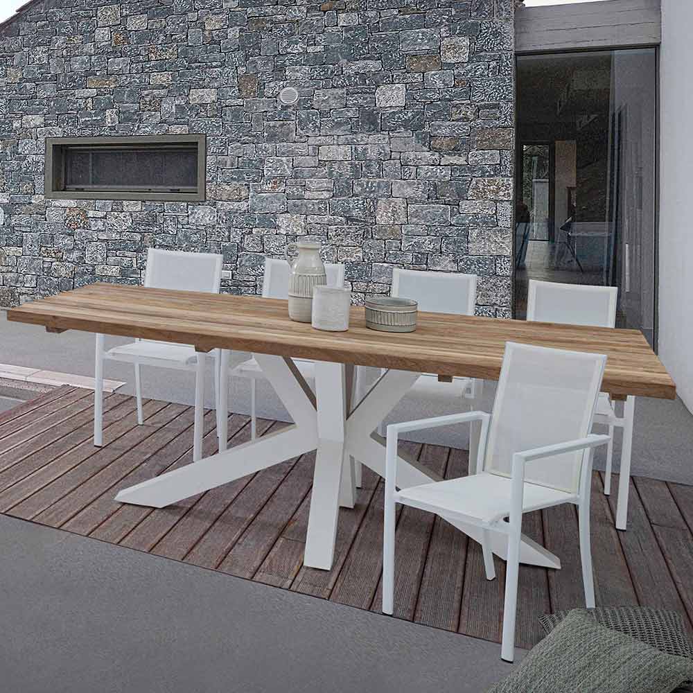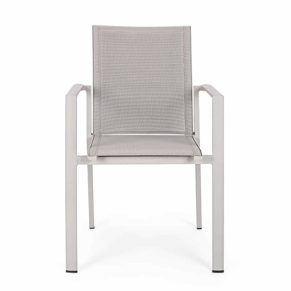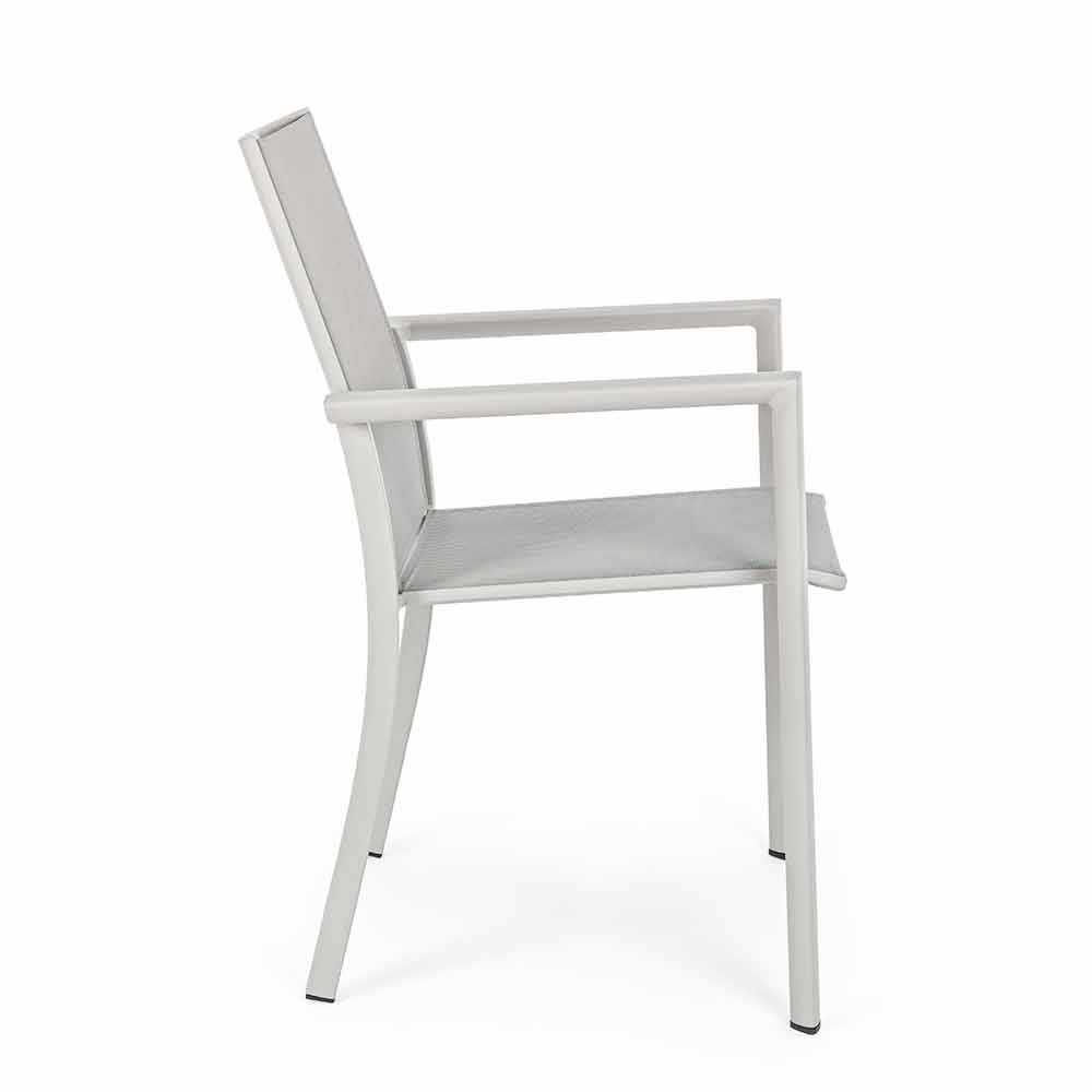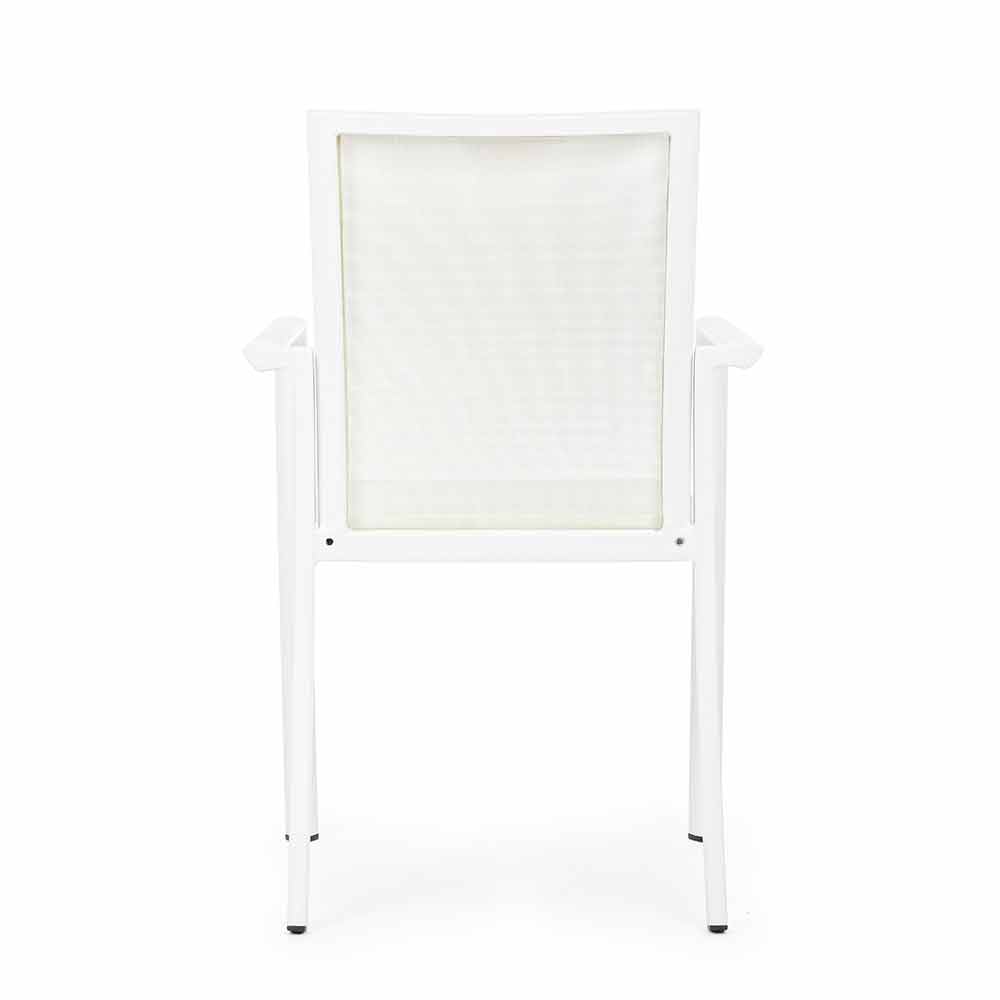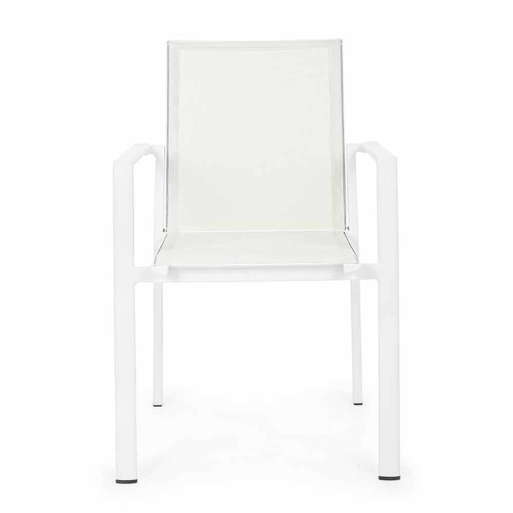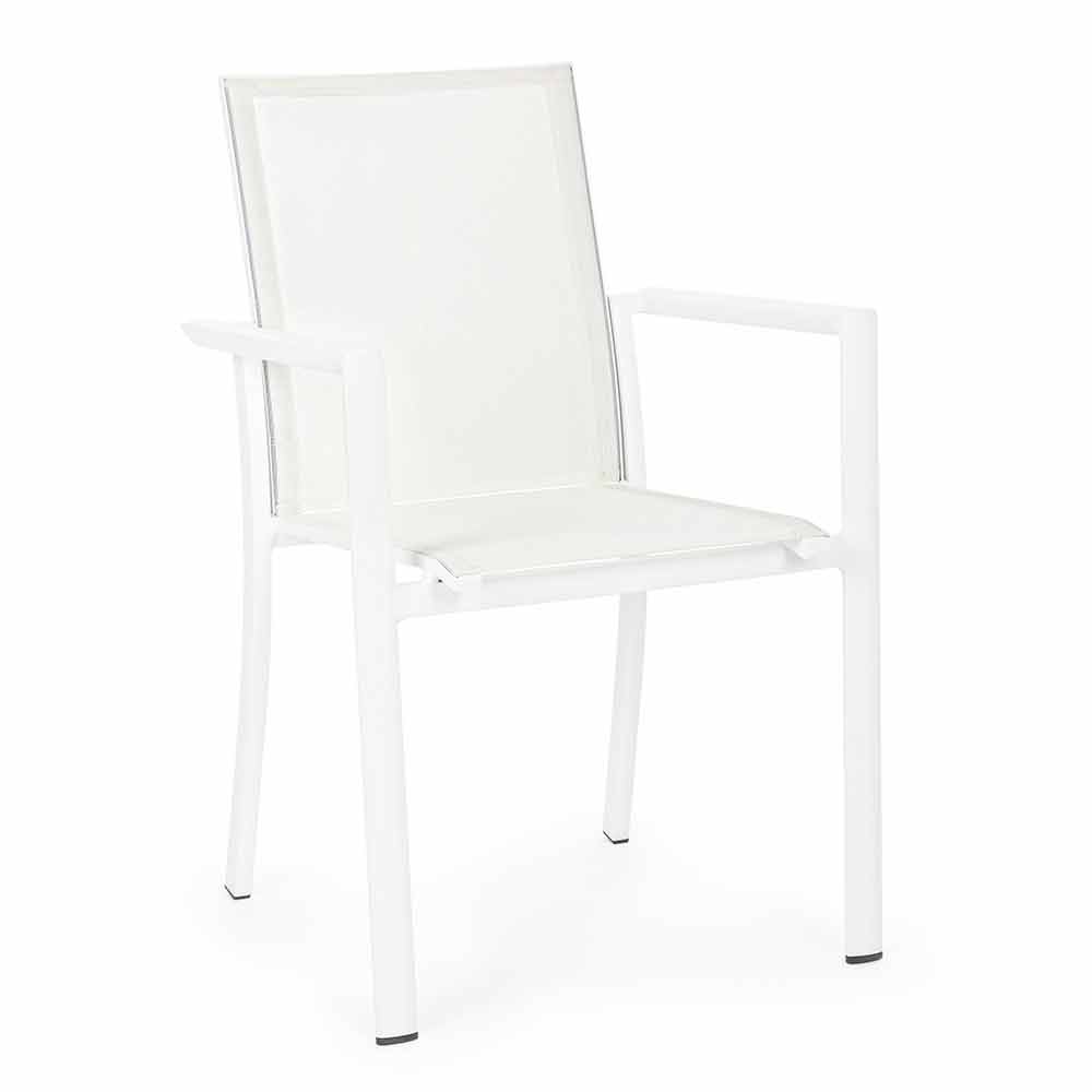 Moderní designová stohovatelná venkovní židle v rastrovém nebo bílém hliníkovém a textilním sedadle.