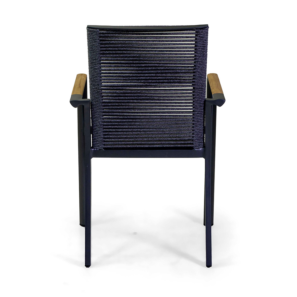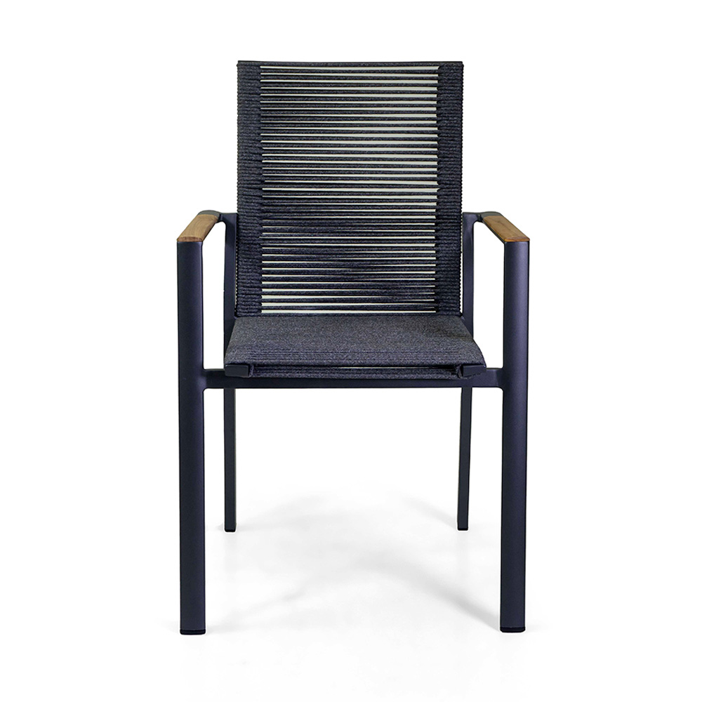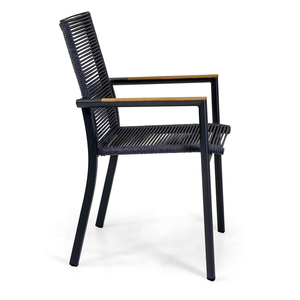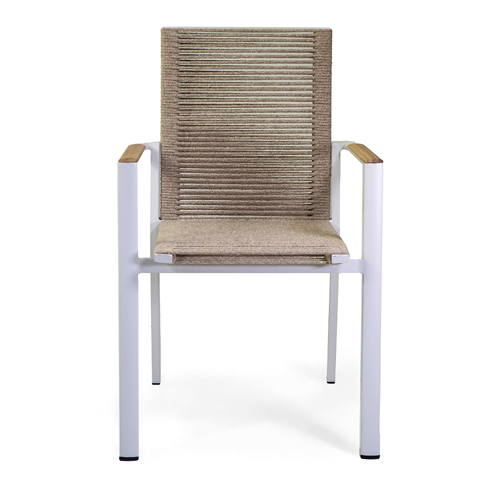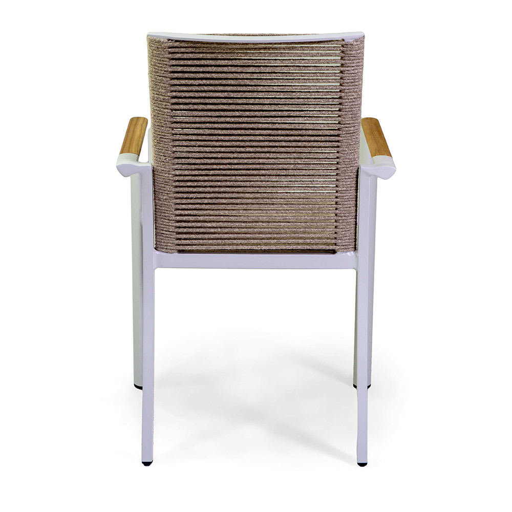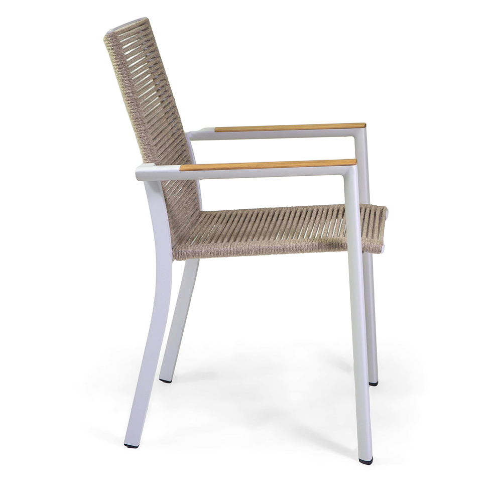 Objevte moderní vzhled a pohodlí naší venkovní židle . Tato židle s elegantním, moderním designem kombinuje pevnost práškově lakovaného hliníku s přírodní krásou provazů. Dřevěné područky dodávají židli nádech tepla a stylu.