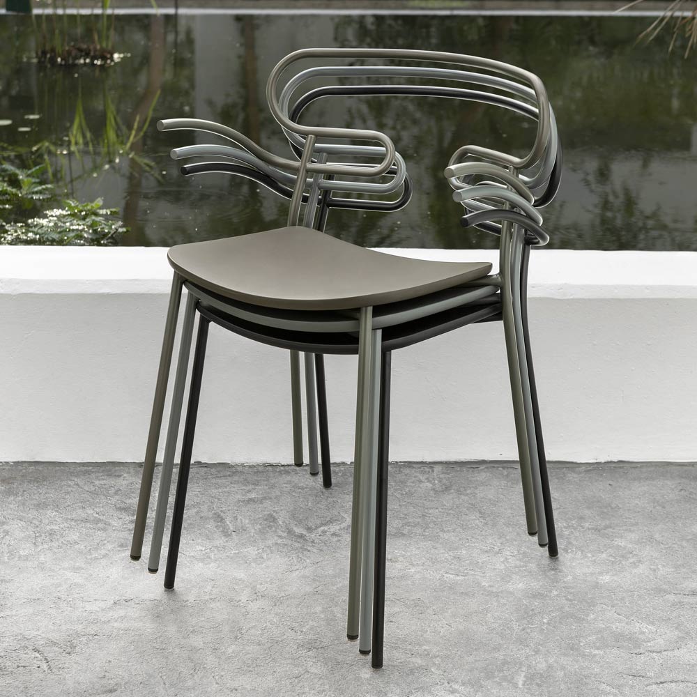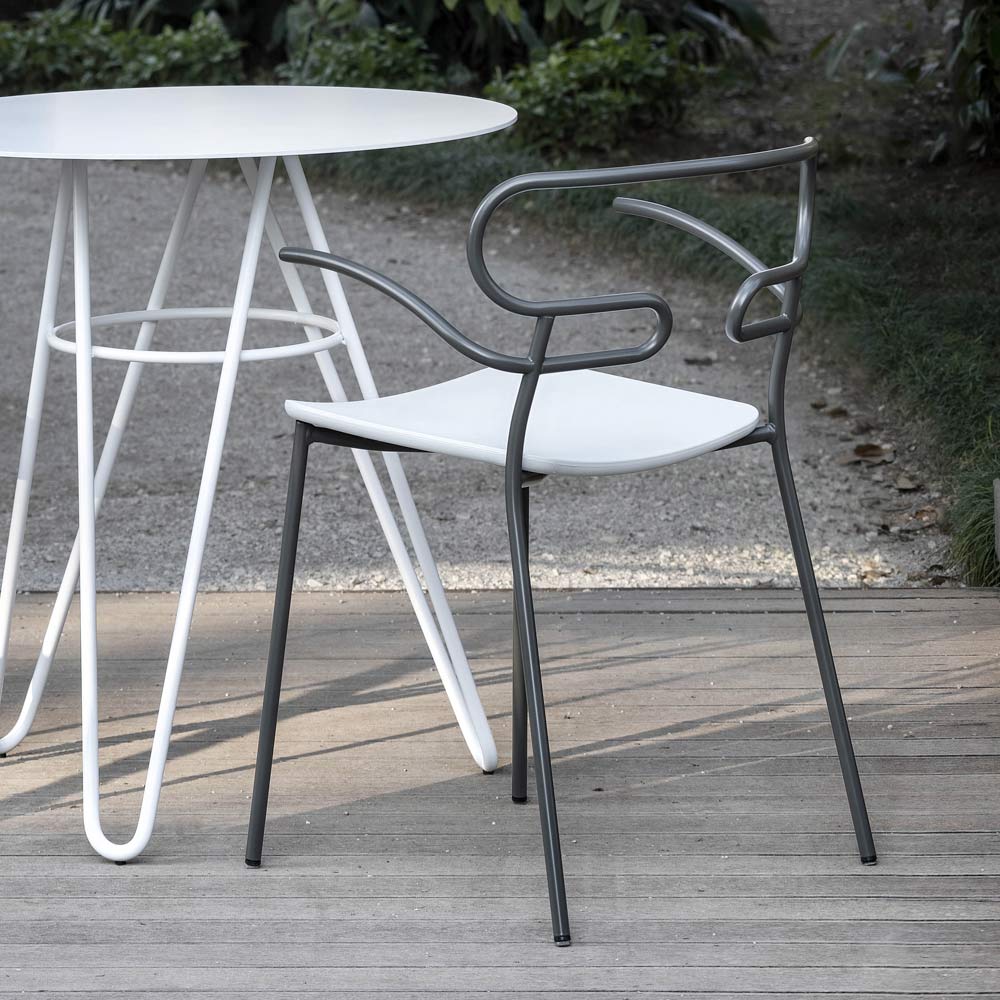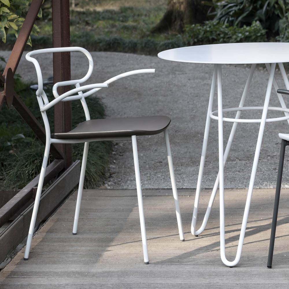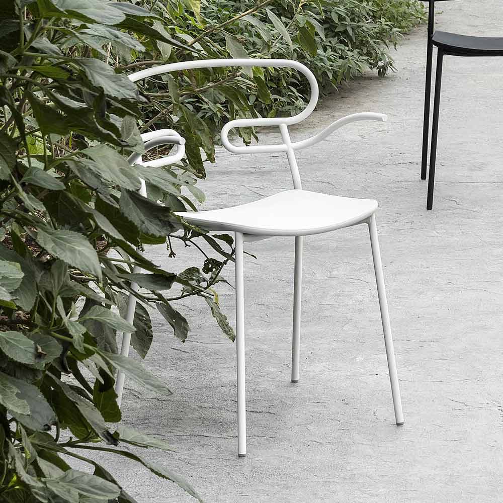 Venkovní židle vyrobená v Itálii s lakovanou kovovou konstrukcí a polyuretanovým sedákem. Jednoduchý a zásadní, tento doplněk vyniká svými světelnými liniemi a zvláštním tvarem opěradla získaného zakřivením jedné kovové trubky, což vytváří neobvyklý a avantgardní design. Ideální pro vyzdobení vašich venkovních prostor s osobností, jako jsou zahrady, verandy a terasy, má obzvláště funkční vlastnost, kterou je možnost stohování pro získání praktického a snadno uspořádaného řešení optimalizací vašich prostor, když nepoužíváte židle.