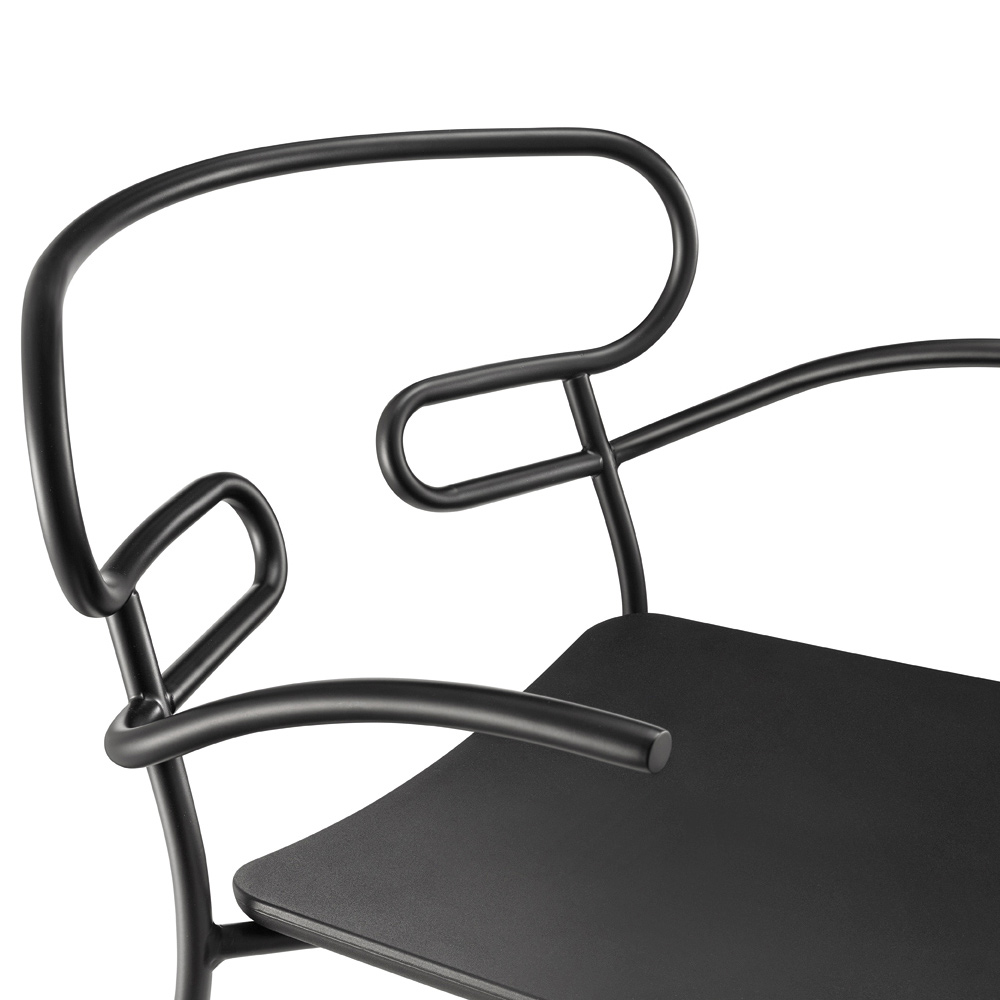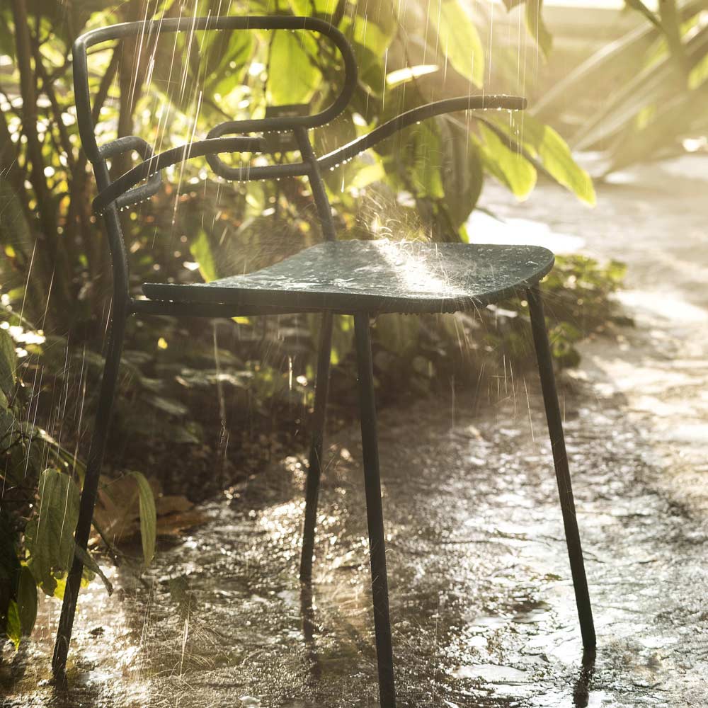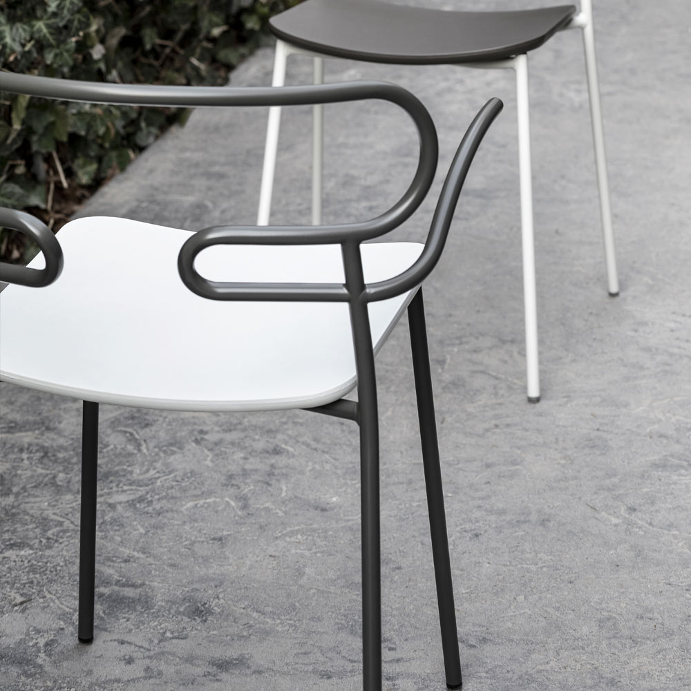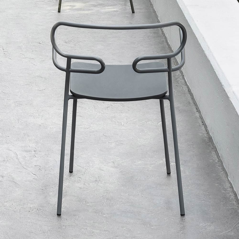 Venkovní židle vyrobená v Itálii s lakovanou kovovou konstrukcí a polyuretanovým sedákem. Jednoduchý a zásadní, tento doplněk vyniká svými světelnými liniemi a zvláštním tvarem opěradla získaného zakřivením jedné kovové trubky, což vytváří neobvyklý a avantgardní design. Ideální pro vyzdobení vašich venkovních prostor s osobností, jako jsou zahrady, verandy a terasy, má obzvláště funkční vlastnost, kterou je možnost stohování pro získání praktického a snadno uspořádaného řešení optimalizací vašich prostor, když nepoužíváte židle.