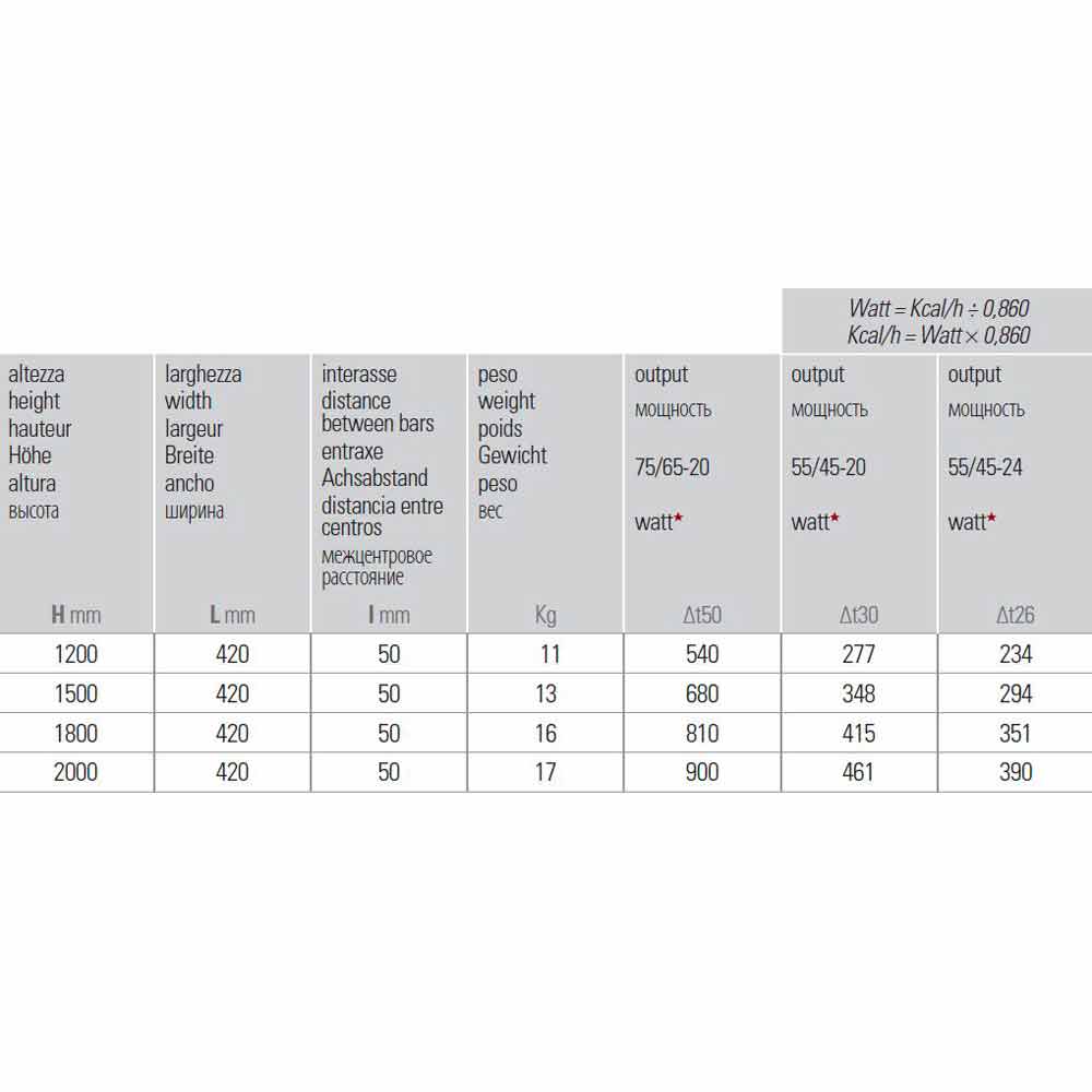 - H 1800 x L 420 x Inter. 50 mm x výkon w (Δt50 *) 810; Výtěžek w (At30 *) 415; Výtěžek w (A26 *) 351;