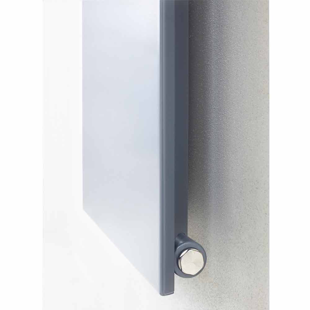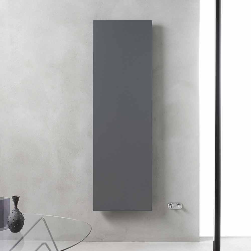 Moderní designový vertikální nástěnný radiátor z břidlicově šedé oceli vyrobené v Itálii.