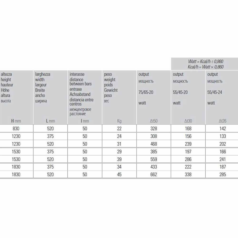 - V 1830 x D 520 x Inter. 50 x P 48 mm x výstup w (Δt50 °) 662; Výtěžek w (At30 °) 338; Výtěžek w (At 26 °) 285