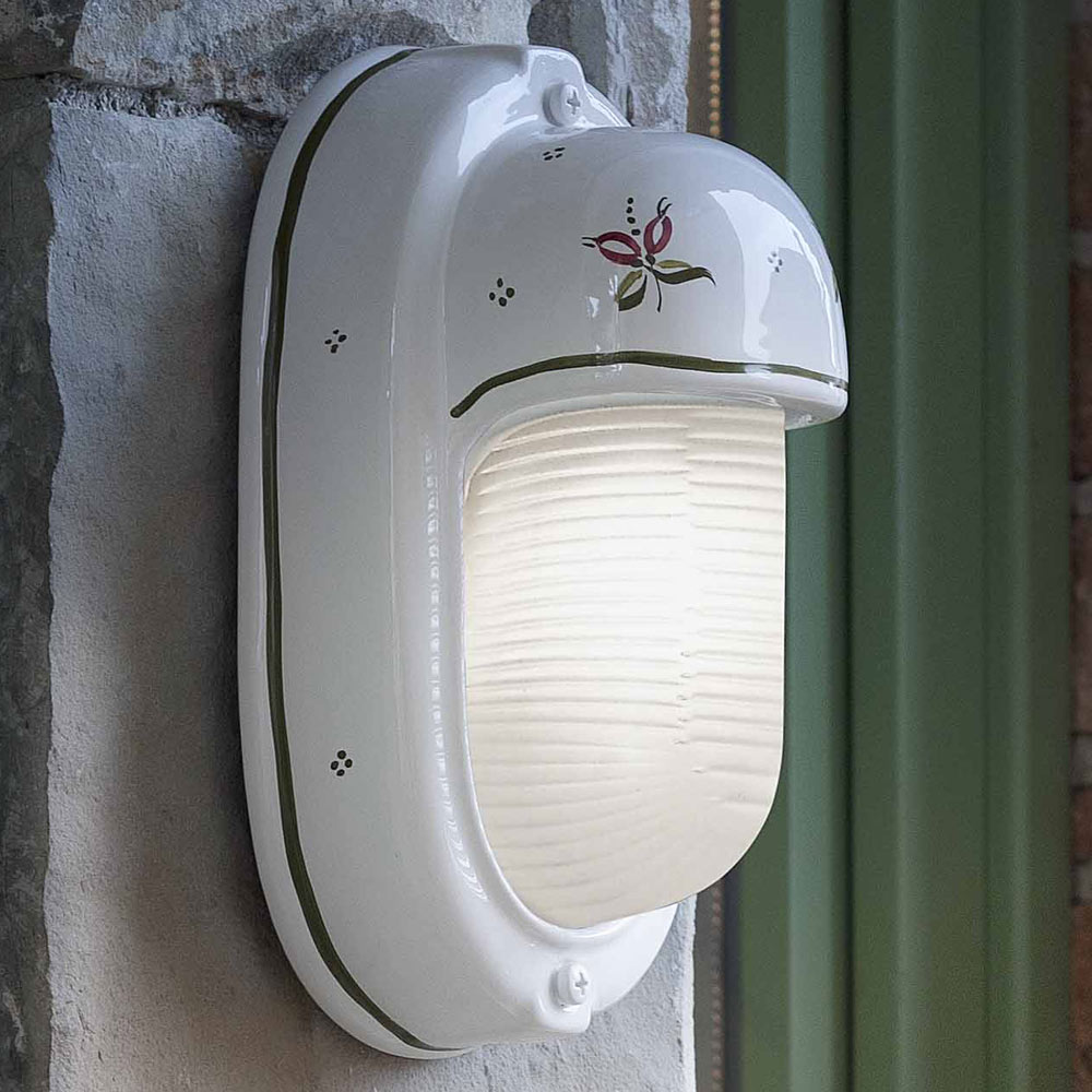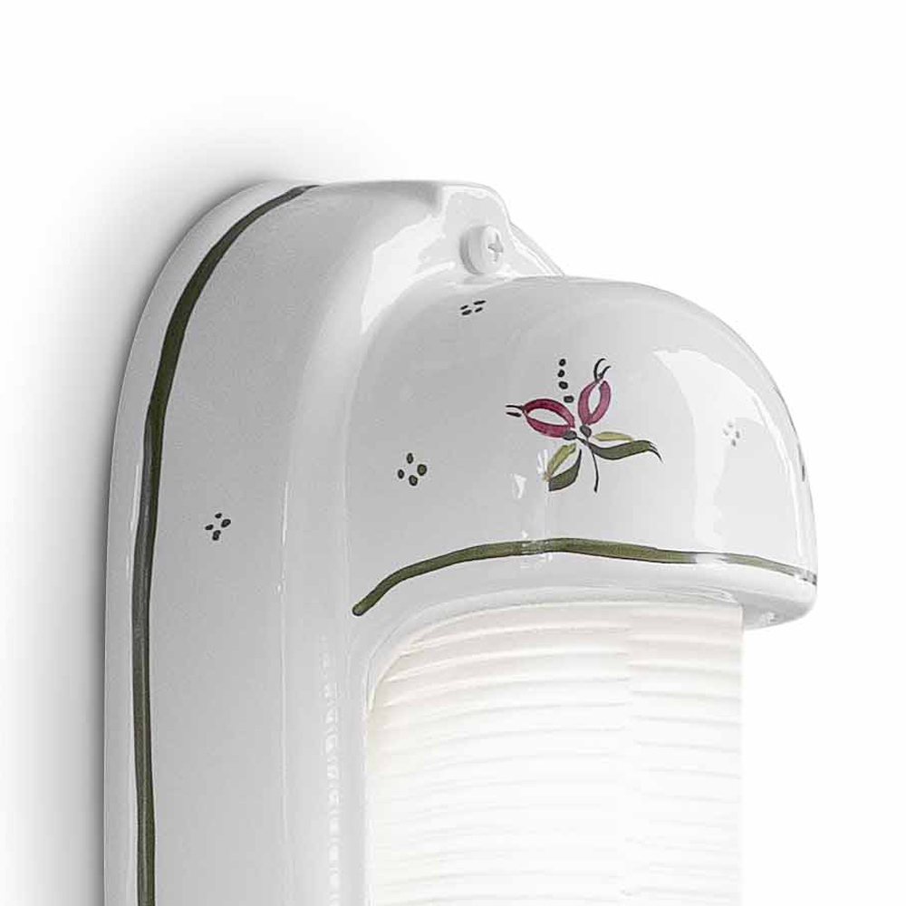 Tato vertikální zahradní nástěnná lampa je celá vyrobena z keramiky zdobené ručně malovanými květinami pro klasický a harmonický styl mezi tvarem a barvami.