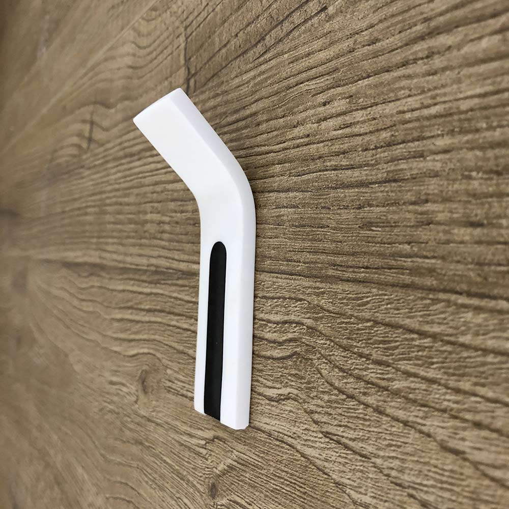 nástěnné závěsy jsou vyrobeny z 6 mm silného bílého corianového pevného povrchu s bílou nebo černou páskovou vložkou.