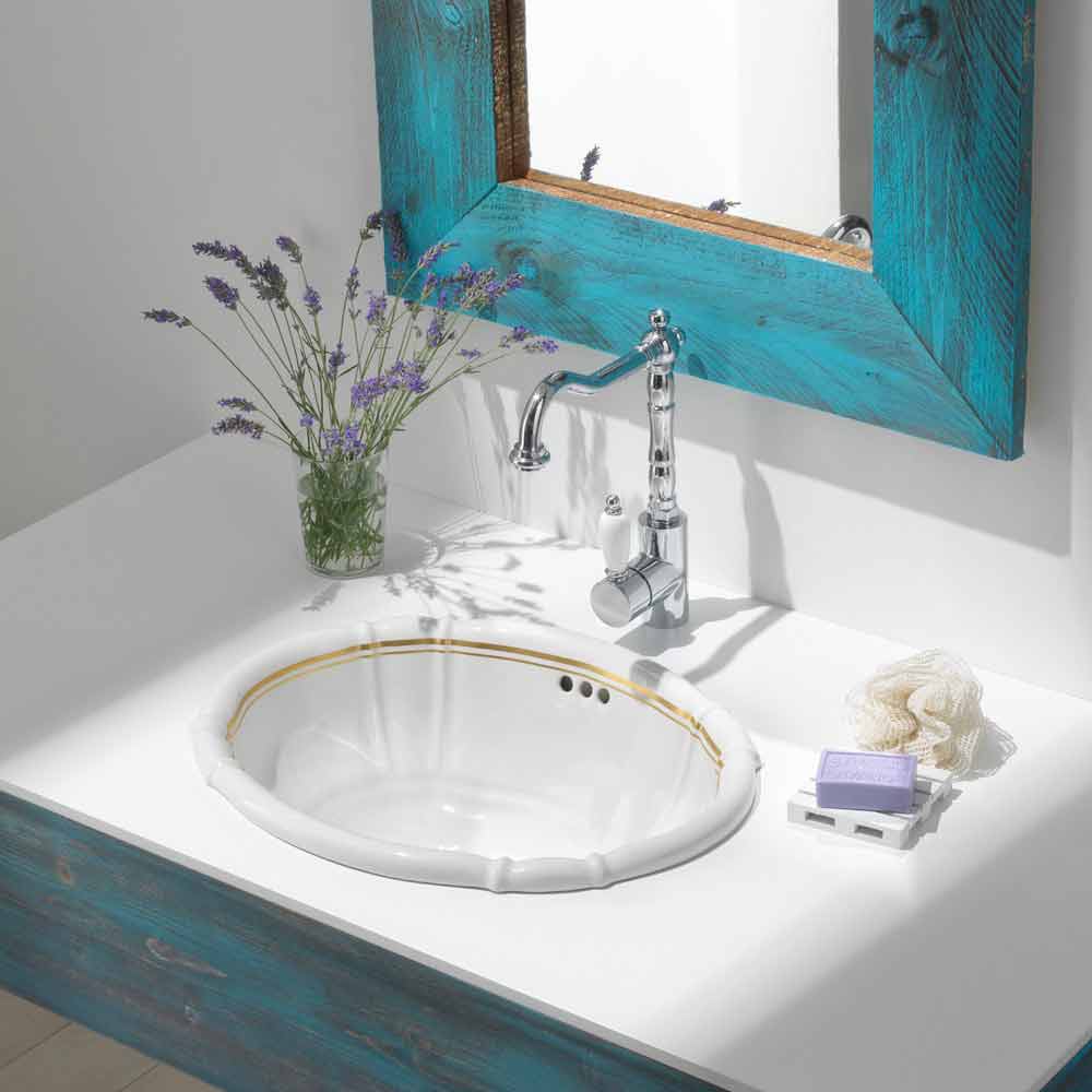 Kruhové zabudované umyvadlo z porcelánu a 24k zlata, Santiago Koupelna vestavěná umyvadlo ručně vyráběné v Itálii v bílém tenkém porcelánu s dvojitou linkou ve zlatě 24k na okraji.