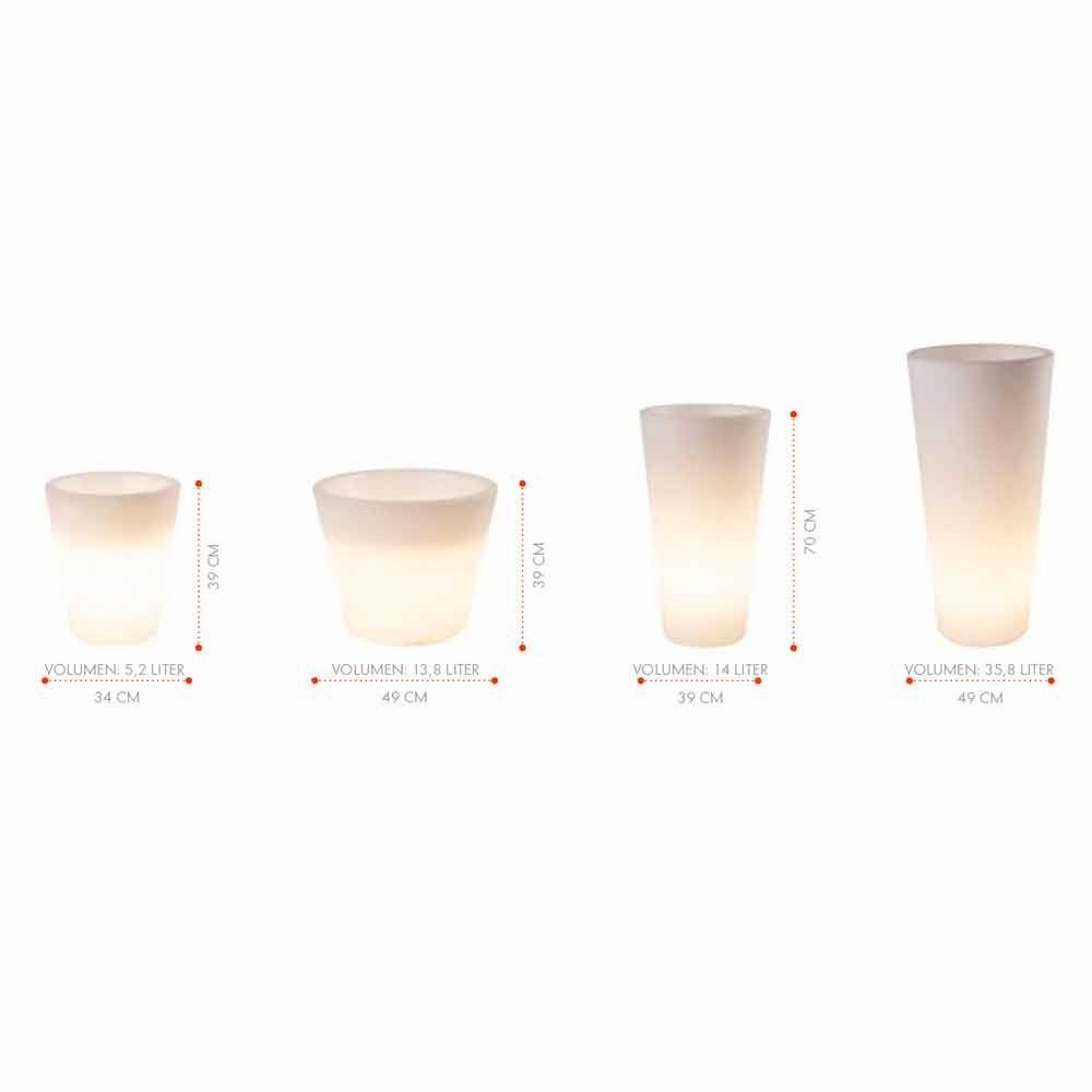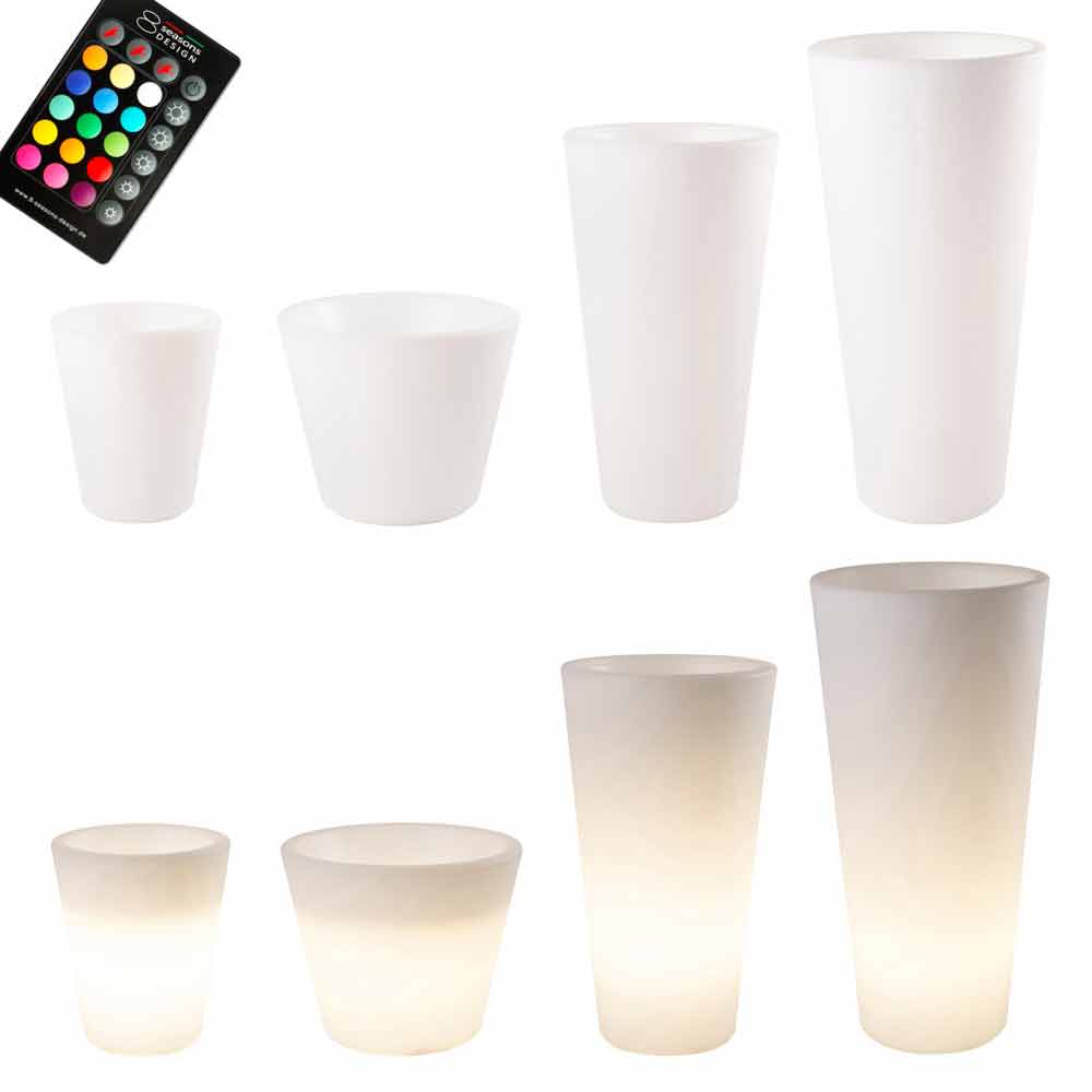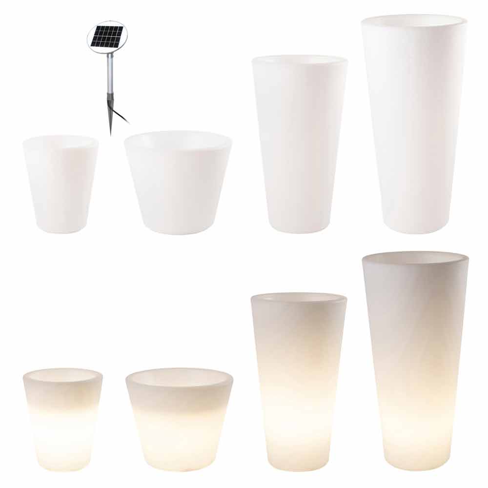 Bílá a moderní designová světelná váza pro vnitřní nebo venkovní použití s ledem nebo solárem v různých velikostech.
