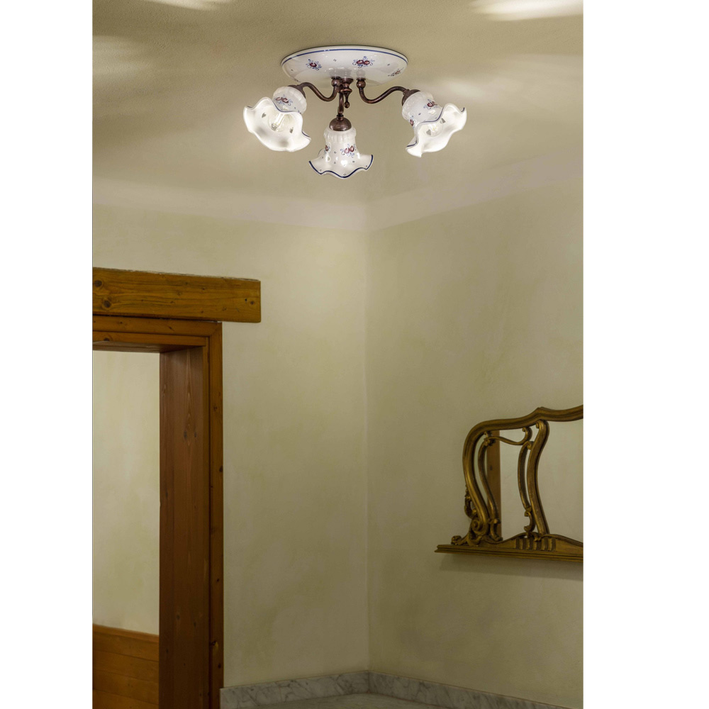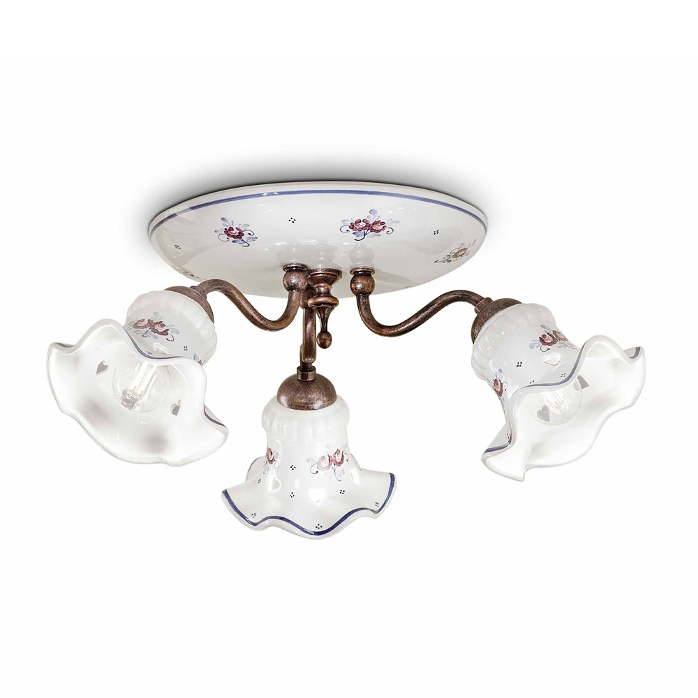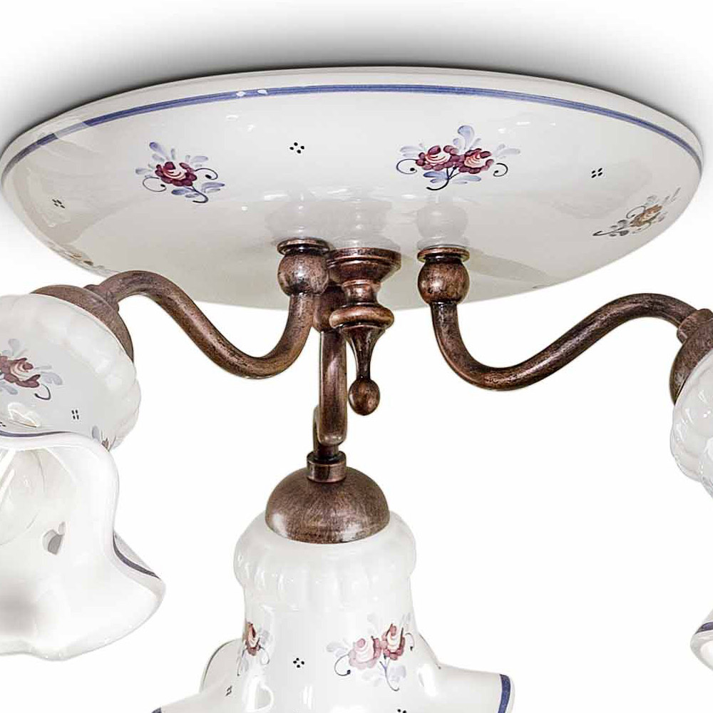 Kulaté stropní svítidlo se 3 světly ze železa a ručně zdobené keramiky, italské výroby Ferroluce.