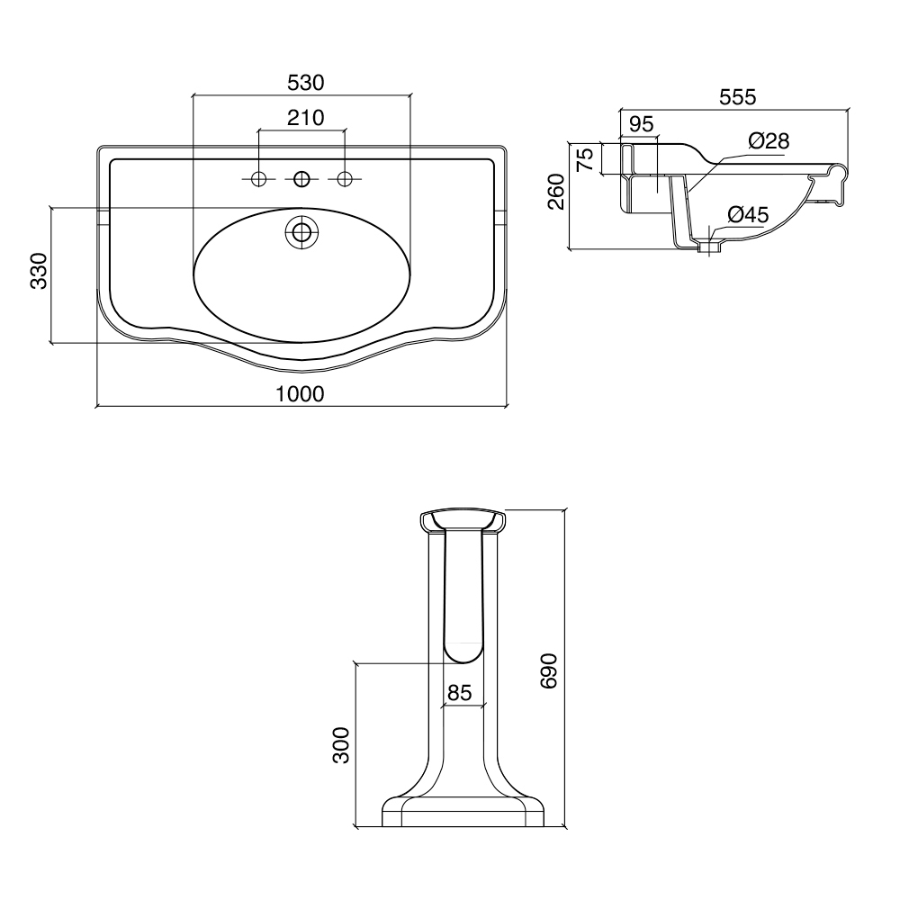 - D 100 x D 55,5 x V 69 cm se zpětným rámečkem a zpětným okrajem 1-3 otvory pro vodovodní baterie - D 1000 mm;