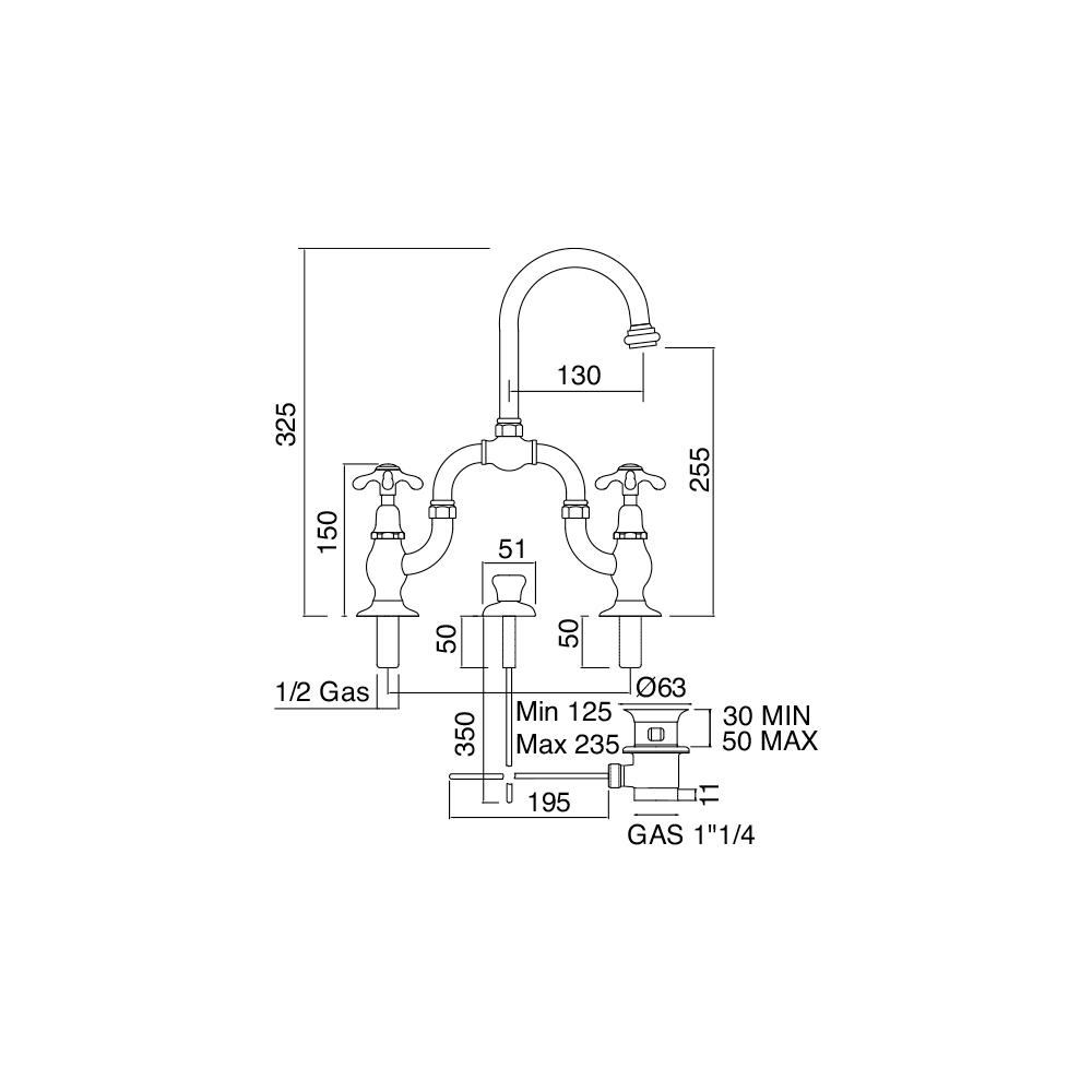 mostová umyvadlová baterie sestava 2-3 otvory s odtokem, nastavitelnou středovou vzdáleností a kloubovou výpustí.