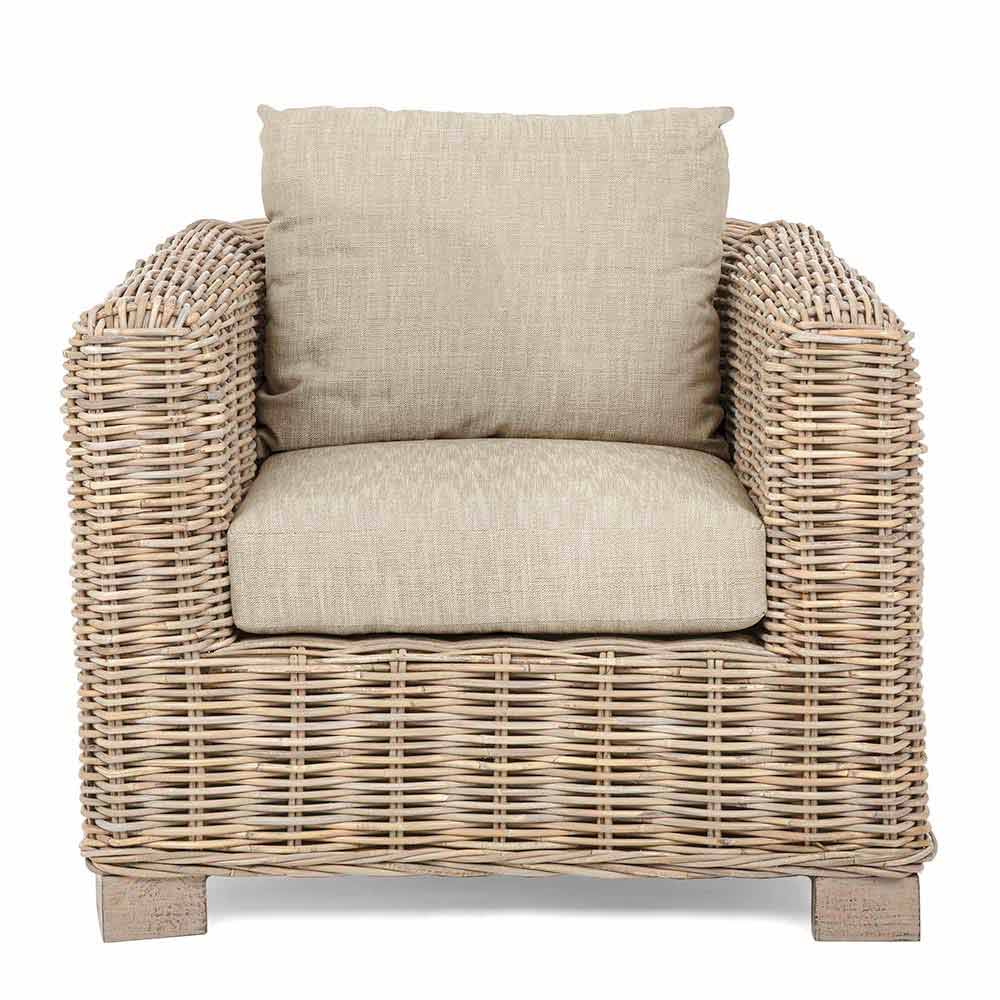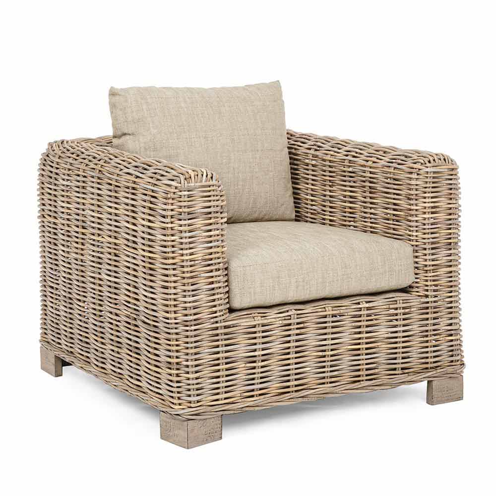 Mango dřevo a ratanová struktura, kubu vazba, přírodní povrchová úprava na bázi nitrocelulózy. Polštáře s odnímatelným potahem pro vnitřní použití (55% bavlna, 45% polyester).