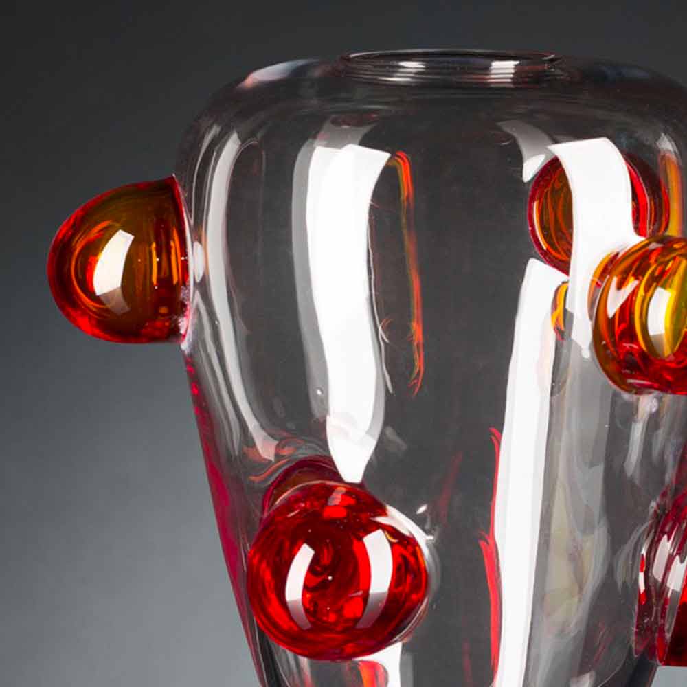 Elegantní vnitřní váza z transparentního foukaného skla Murano s červenými detaily prostřednictvím procesu zcela vyrobeného v Itálii . Doplněk, který kombinuje extrémní eleganci skla Murano a jeho úžasné vlastnosti s moderním a živým designem, aby dal život myšlence exkluzivního a avantgardního nábytku schopného obohatit jakýkoli domácí prostor, a nikoli barevným nádechem . Ideální styl pro nejrůznější prostředí, od bytového vybavení po hotely, restaurace, smluvní prostory, lázně, ale také jako prostředí pro akce a svatby.