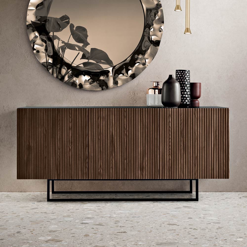 Elegantní designová příborník vyrobená v Itálii , ideální pro stylové vybavení vašeho obývacího pokoje nebo jídelny . Jeho moderní design vyniká grafickou silou svých povrchů, které proměňují úložnou jednotku v rafinovaný, vizuálně výrazný dekorativní prvek.