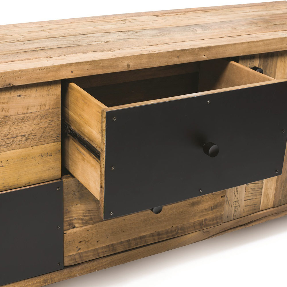 Vnitřní příborník z recyklovaného dřeva v přírodní kávové barvě s 1 dvířky, 2 dřevěnými předními zásuvkami, 2 černými kovovými předními zásuvkami a kovovými nožičkami.