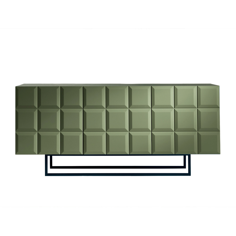 Designová příborník vyrobená v Itálii s reliéfními geometrickými dvířky a kovovou základnou