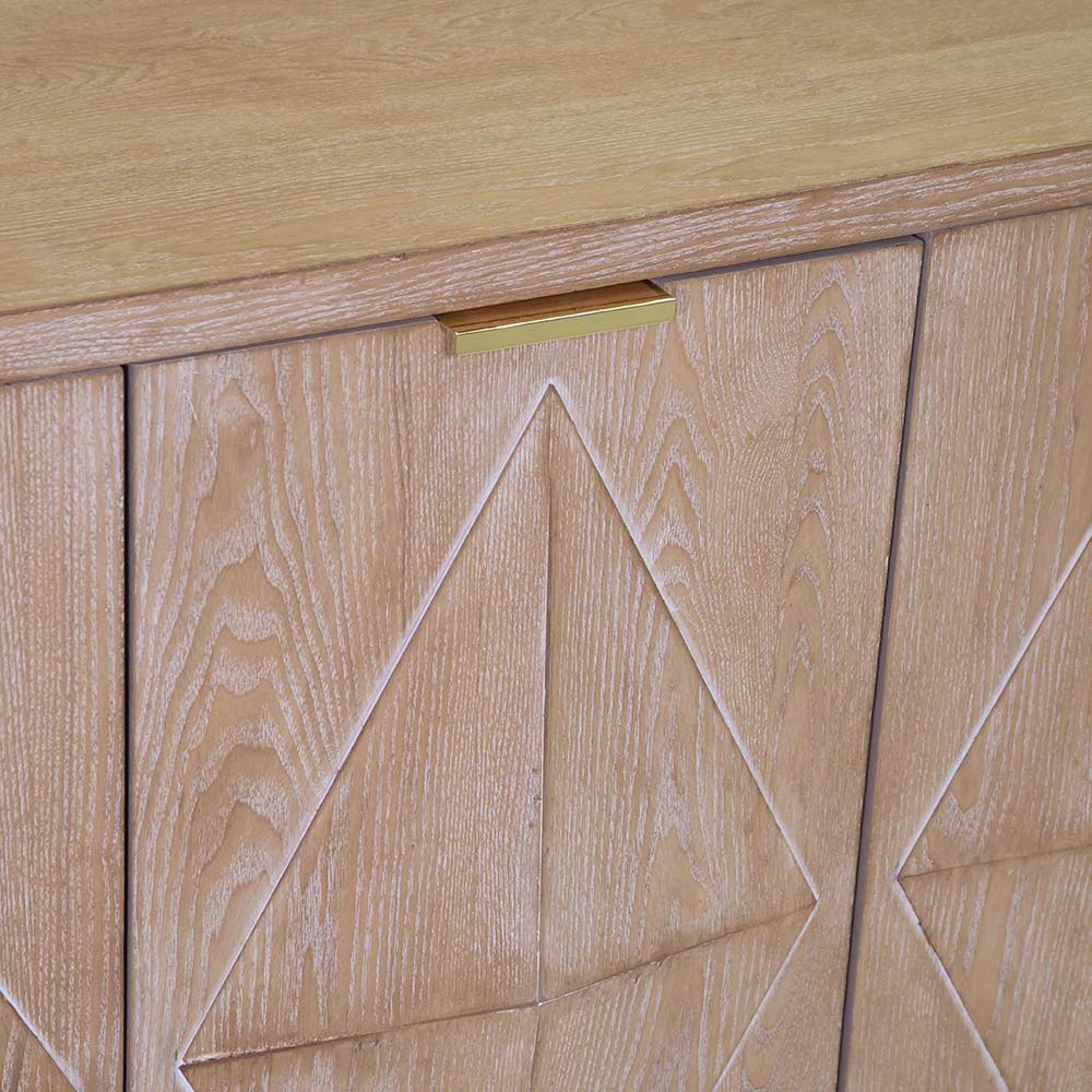 Nožky z jedlového dřeva dodávají skříni pevnou konstrukci, obohacenou o čistý a moderní design. Dvířka, zdobená rytým geometrickým vzorem, jim dodávají nádech originality a rafinovanosti.
