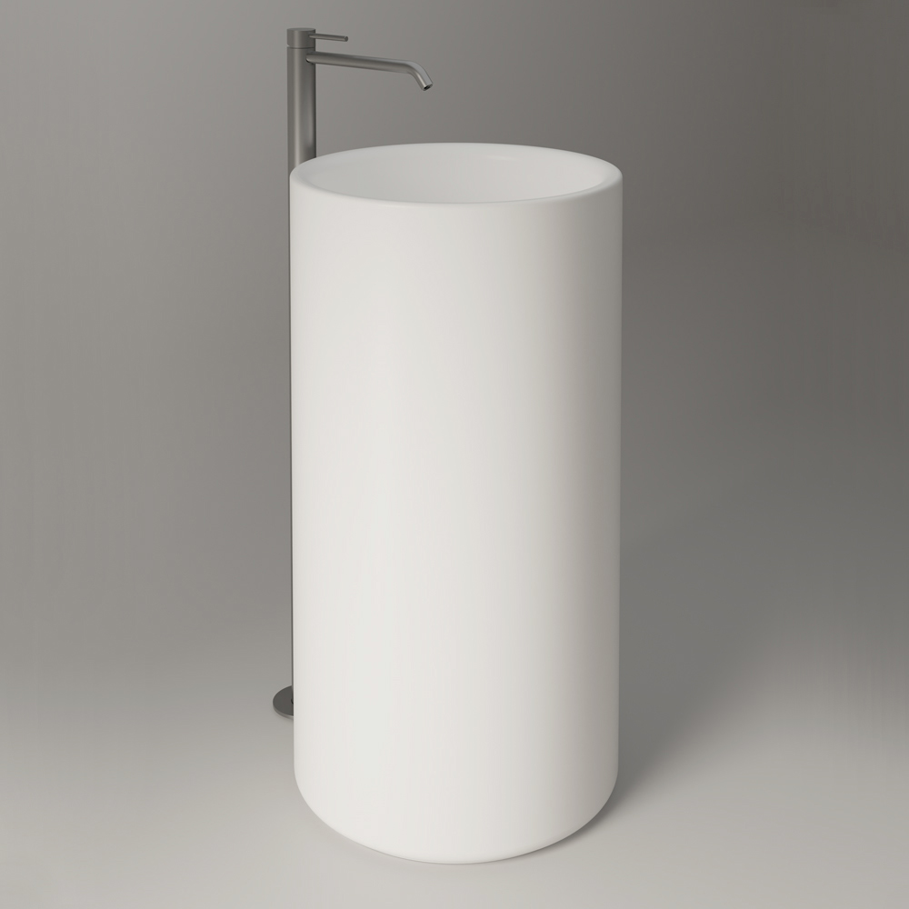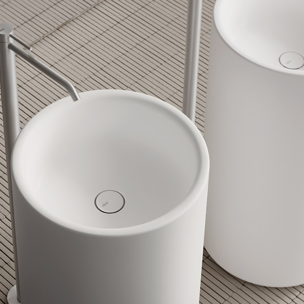 Toto volně stojící keramické umyvadlo má jednoduchý a harmonický válcový tvar, který dokáže proměnit koupelnu v sofistikovaný prostor s velkou osobitostí.