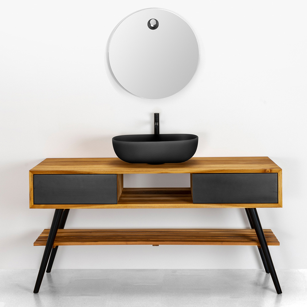 Koupelnová skříňka z přírodního teaku s černými nohami a zásuvkami.