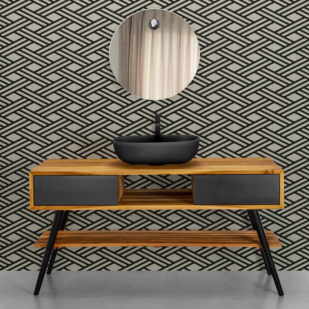 Volně stojící koupelnová skříňka se strukturou z recyklovaného přírodního teaku obohacená o 2 zásuvky z matně černého lakovaného mahagonového dřeva, které ladí s nohami. Elegantní a stylová barevná volba, která vynikne v každé situaci při zařizování, je fascinující a tajemná a vypovídá o exkluzivní atmosféře a jedinečných emocích. Záměrně grafická estetika umocněná ještě více kombinací dvojité zásuvky na fasádu.
