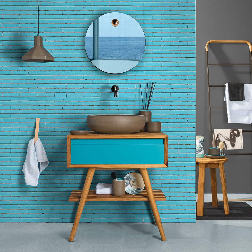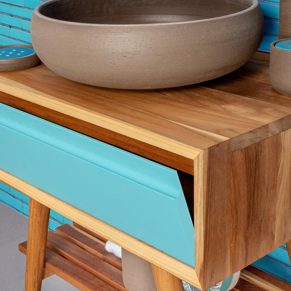 Podlahová koupelnová skříňka z přírodního recyklovaného teaku s výklopnou zásuvkou v modrém mahagonovém dřevě , barvě, která odkazuje na klid a vyrovnanost spojenou s přírodními živly, jako je voda a vzduch, nabízí relaxační účinky, emoce, které odkazují na kouzlo panování přírody. Jeho struktura se vyznačuje jednoduchými tvary a praktickými prostory ideálními pro elegantní a funkční uspořádání prostoru koupelny pro originální výsledek se silnou moderní osobností .
