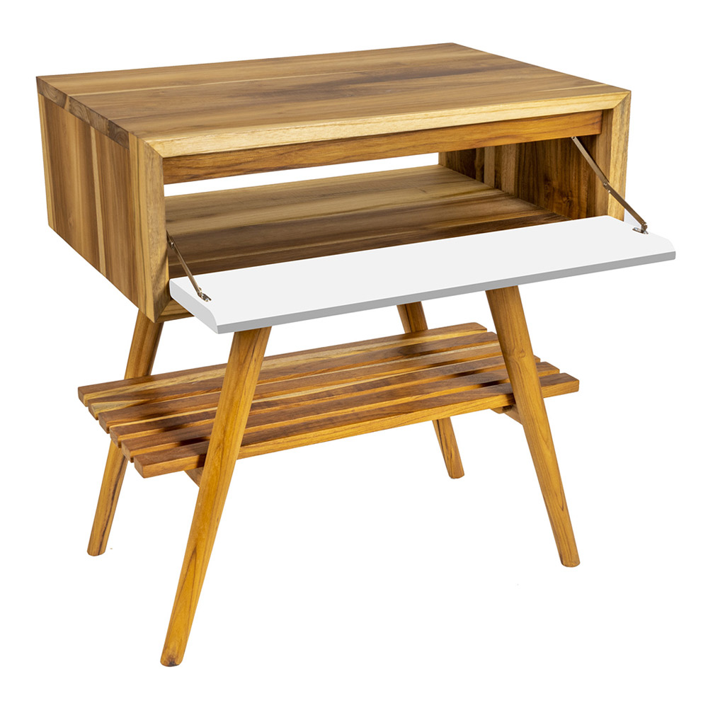 Podlahová teaková koupelnová skříňka s bílou výklopnou zásuvkou.