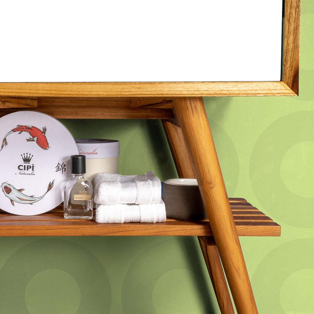 Volně stojící koupelnová skříňka s recyklovanou přírodní teakovou strukturou a výklopnou zásuvkou z bílého mahagonového dřeva , barvy, která představuje koncept míru, svobody, očisty a nového začátku, připomínající bělost sněhu a jas přírody ve svém nejčistší formě. Jeho struktura se vyznačuje jednoduchými tvary a praktickými prostory ideálními pro elegantní a funkční uspořádání prostoru koupelny pro originální výsledek se silnou moderní osobností .
