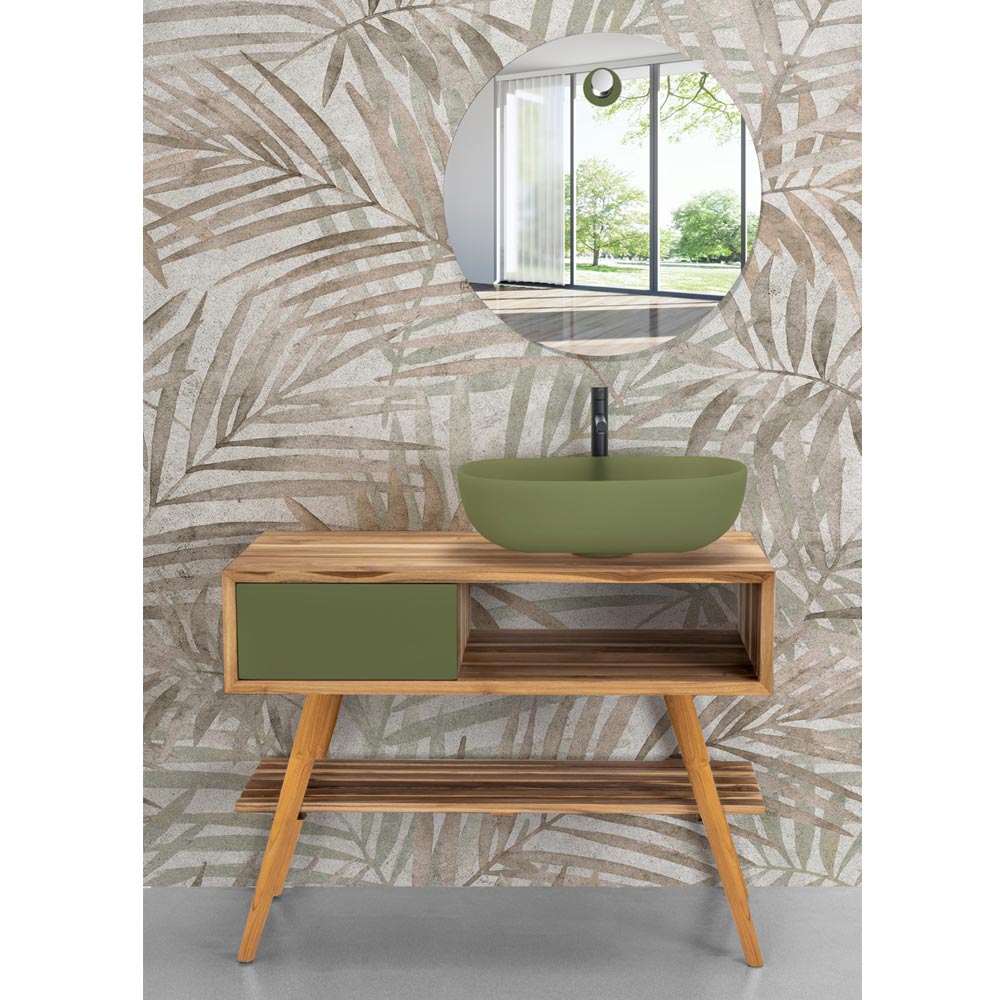 Koupelnová skříňka z přírodního teaku se zeleným mahagonovým šuplíkem.