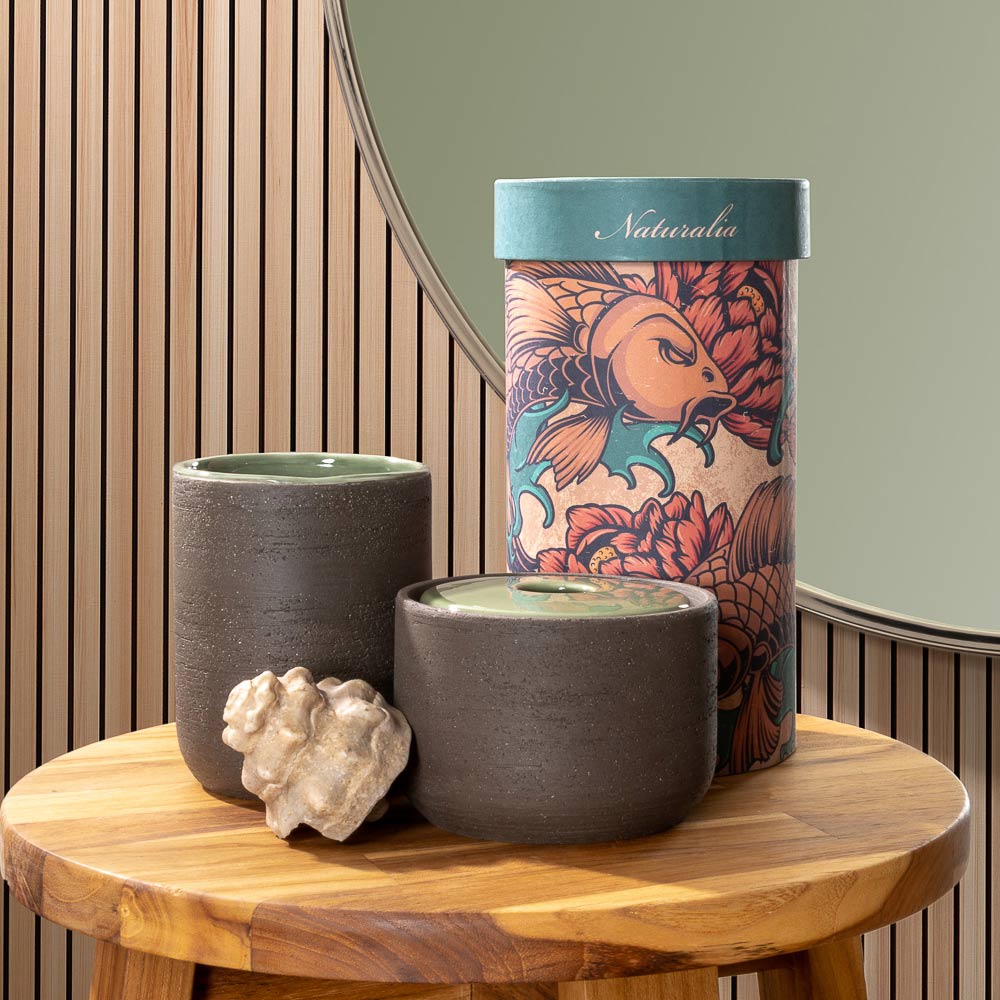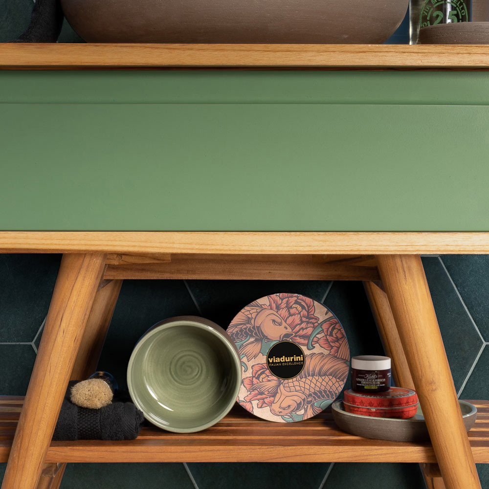 Koupelnové doplňky ze žáruvzdorné hlíny se zeleným smaltovaným interiérem Made in Italy.