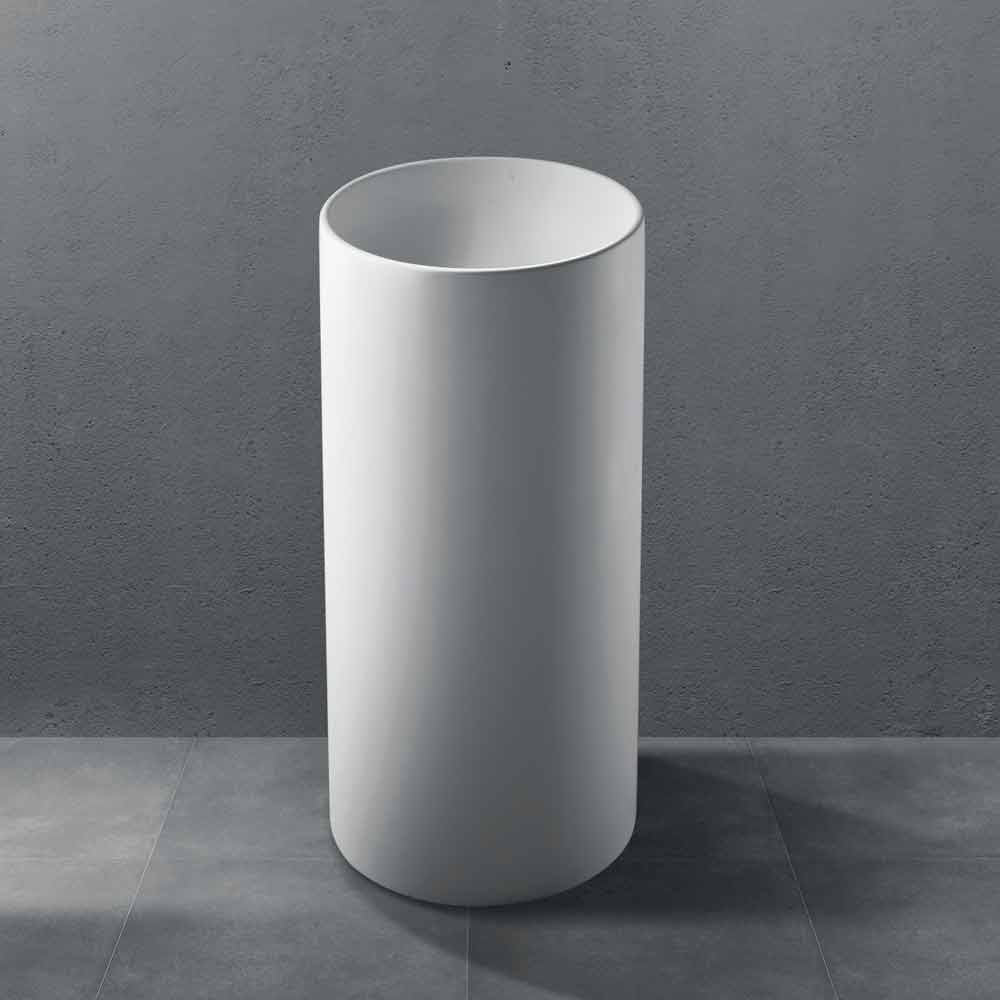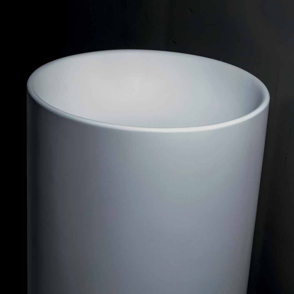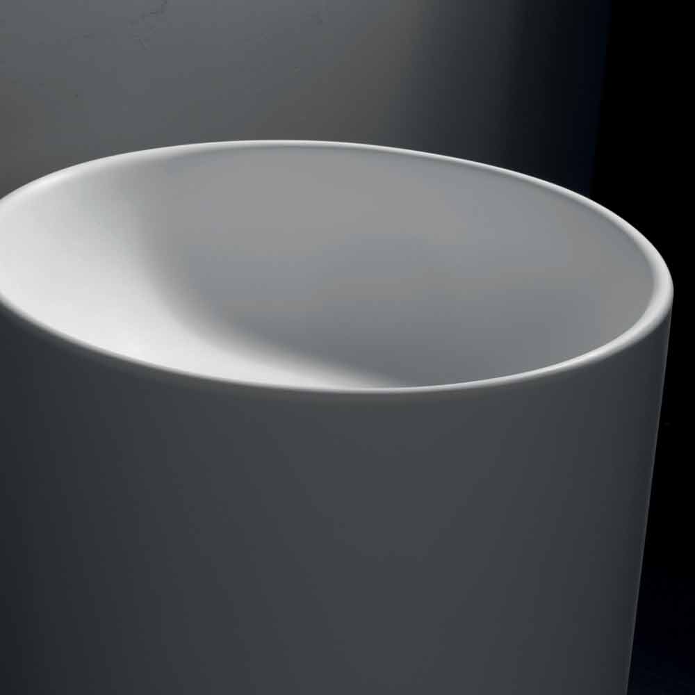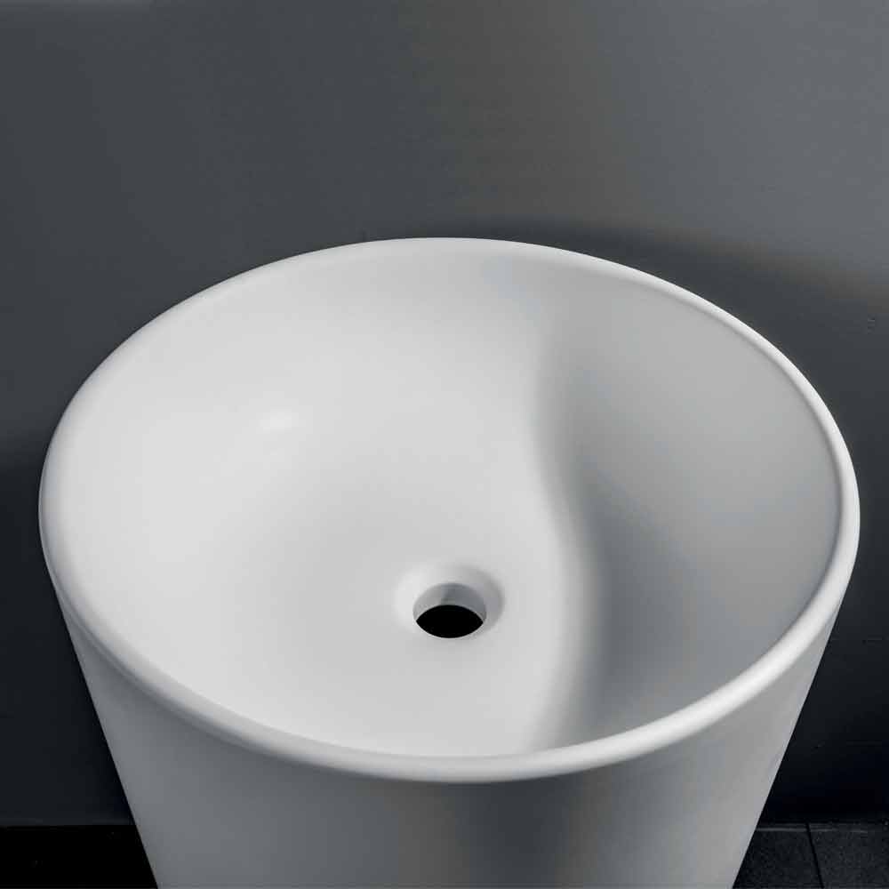 Samostatně stojící koupelnové umyvadlo v bílé pryskyřici.