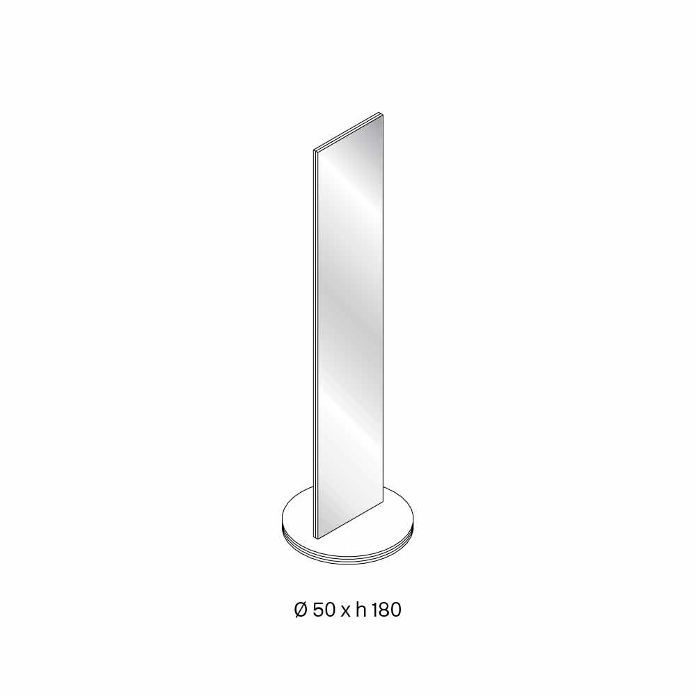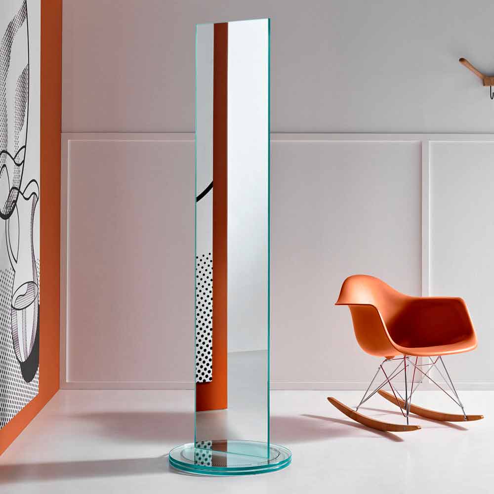 Toto volně stojící zrcadlo se vyznačuje svým sochařským designem zcela vyrobeným z oboustranného zrcadla s otočnou základnou z tvrzeného skla.