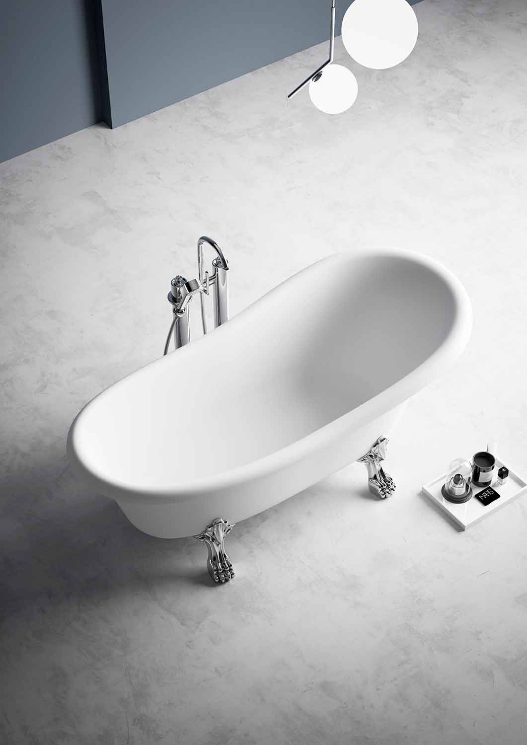 nabízí designu neomezený rozsah technických a estetických možností . Jeho hedvábný a teplý dotek v kombinaci s jeho minerálním aspektem a jeho indikací odrazu světla z něj činí materiál schopný proměnit jakýkoliv předmět do protagonisty koupelny.