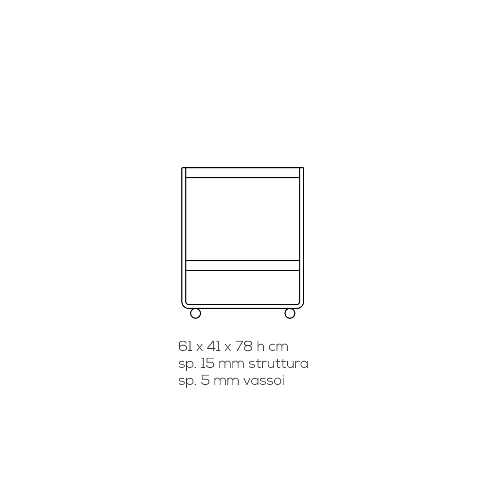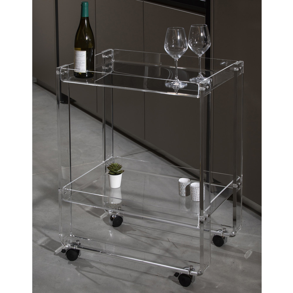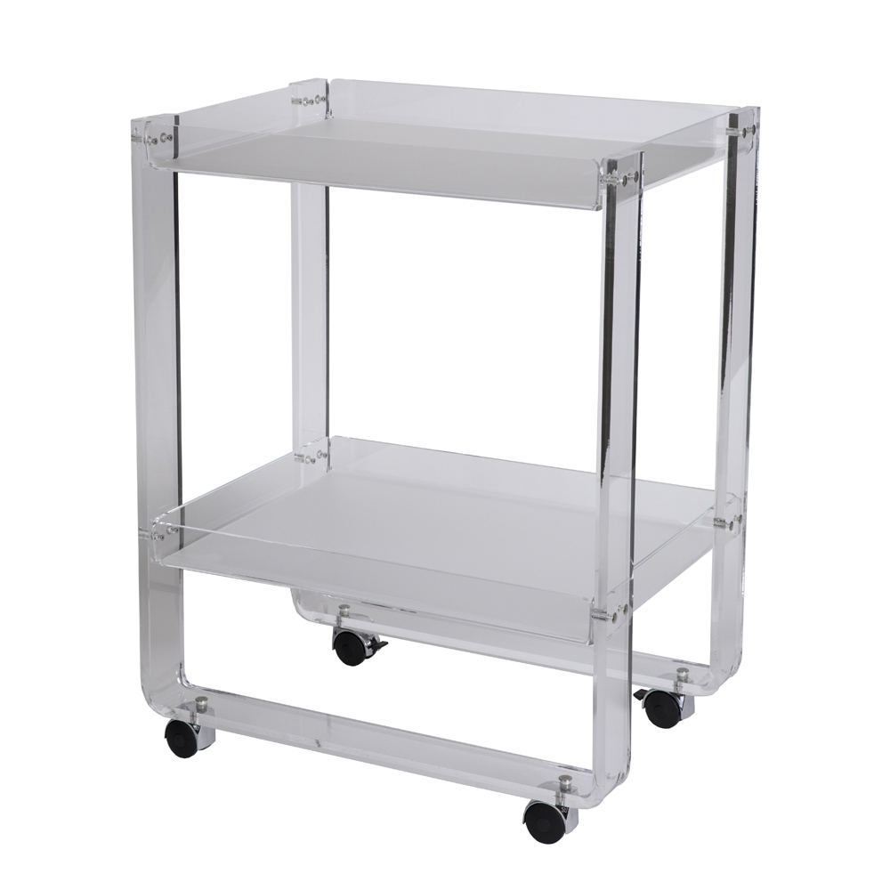 Transparentní akrylový křišťálový vozík s kolečky a 2 policemi, vyrobený v Itálii.