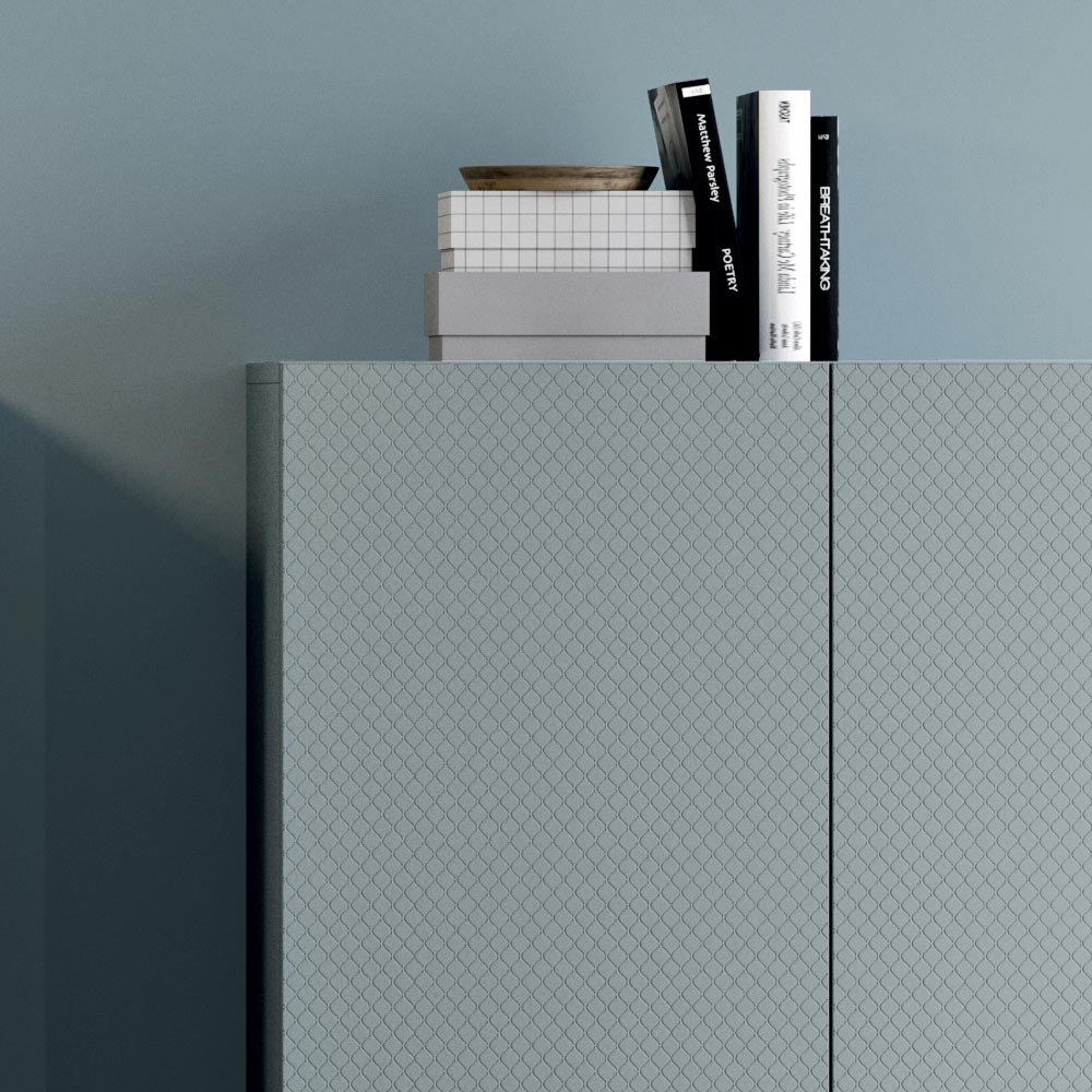 příborník do obývacího pokoje má strukturu vyrobenou z matného laku v barvě mlhy, s