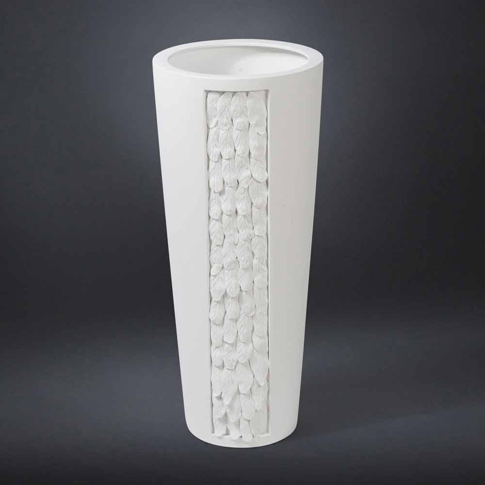 Vysoká váza pro interiéry vyrobené v Itálii z neprůhledné bílé keramiky řemeslným postupem . Estetika přerušovaná základními tvary obohacená o elegantní detail s listovou strukturou, která zakrývá část struktury vázy. Tento detail spolu s vybranou rafinovanou povrchovou úpravou dodávají tomuto doplňku veškerou jeho osobnost, což z něj dělá dokonalé řešení pro prostory charakterizované elegantním stylem . Díky použití keramiky a řemeslného zpracování je produkt exkluzivním a rafinovaným dekorativním prvkem, zvyšuje jeho hodnotu a zdůrazňuje jeho kvalitu. Ideální estetika pro nejrůznější prostředí, od bytového vybavení po hotely, restaurace, smluvní prostory, lázně, ale také jako prostředí pro akce a svatby.
