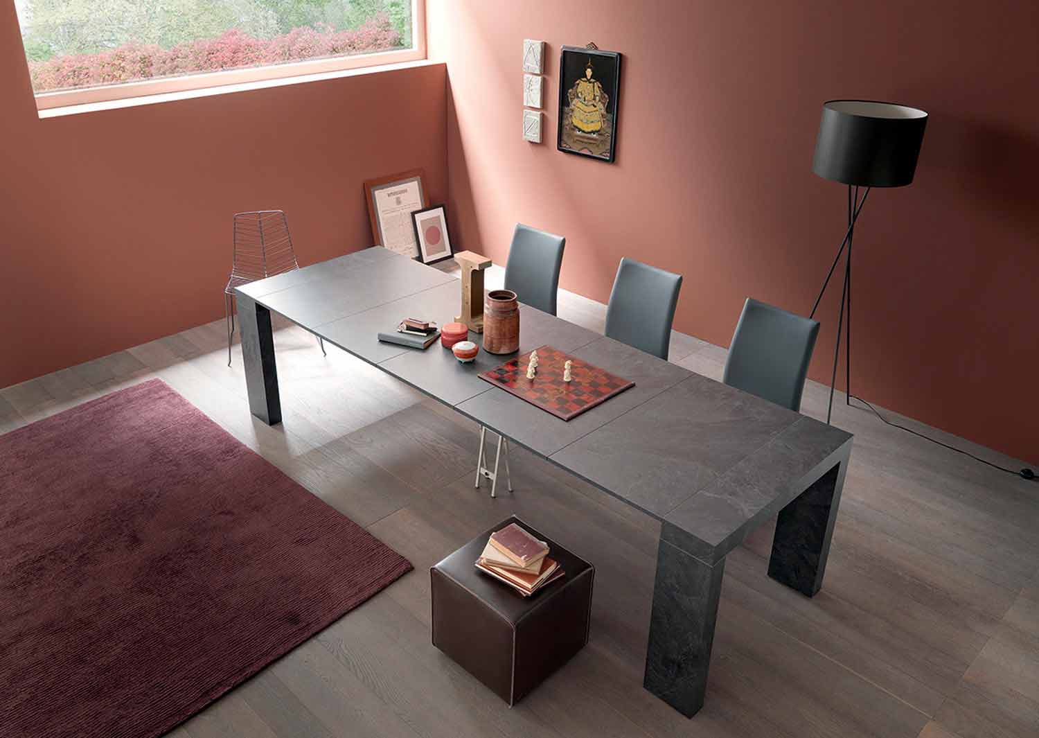 rozšiřitelná konzole se vyznačuje důležitým a monumentálním designem, který se scénickým a funkčním způsobem stává protagonistou místnosti.