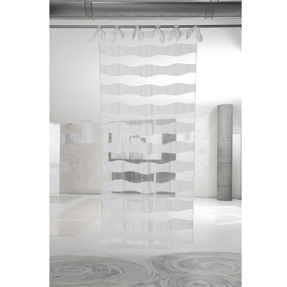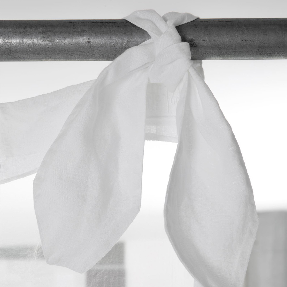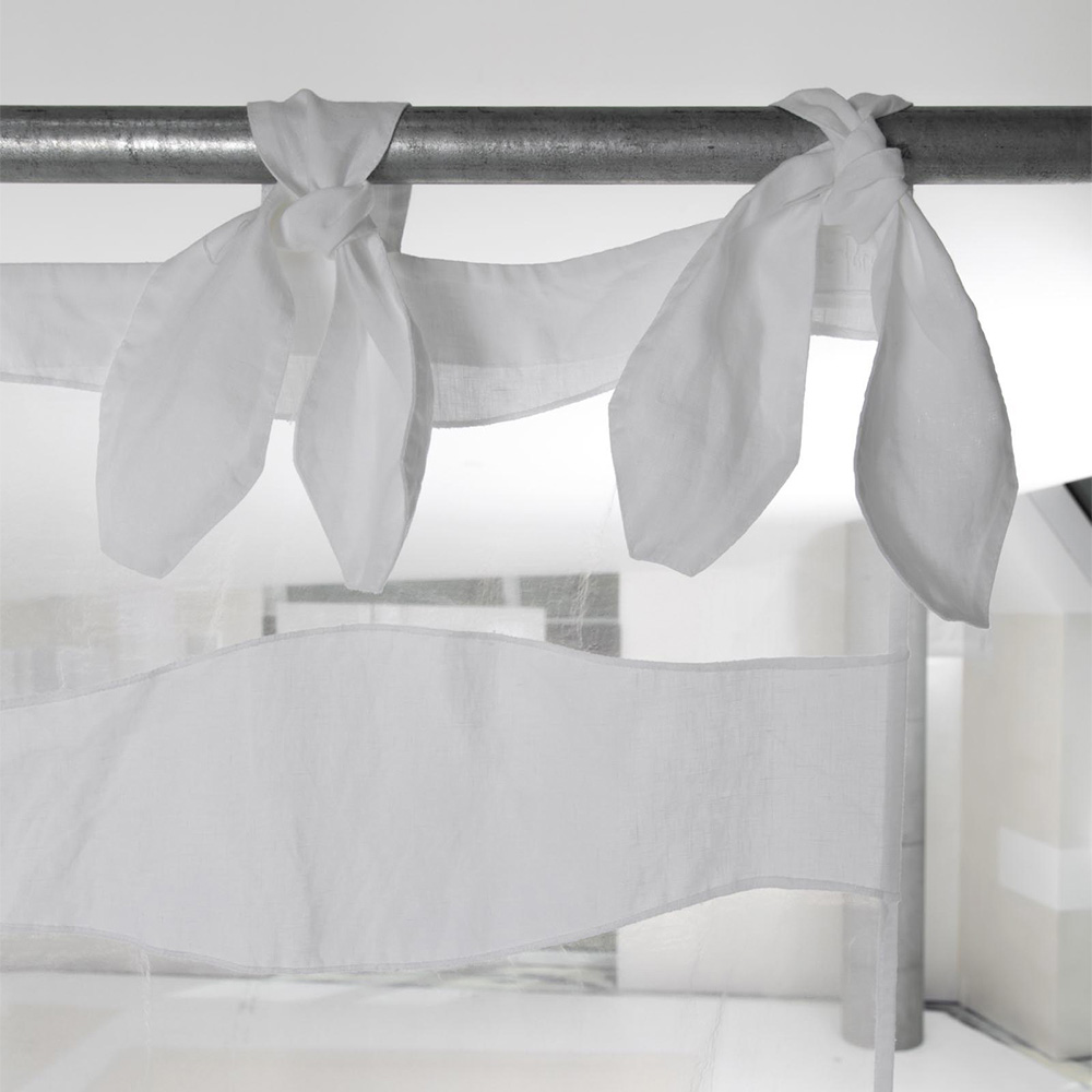 Bílý plátěný a organzový závěs s vlněnou výšivkou a šněrováním, ručně vyráběná kvalita vyrobená v Itálii.