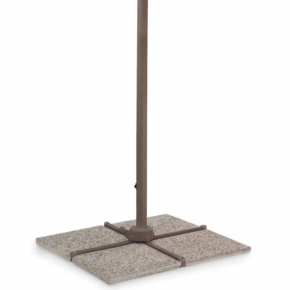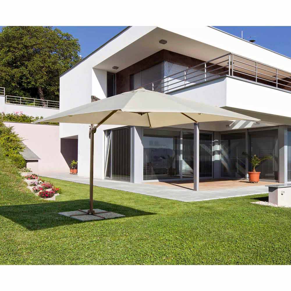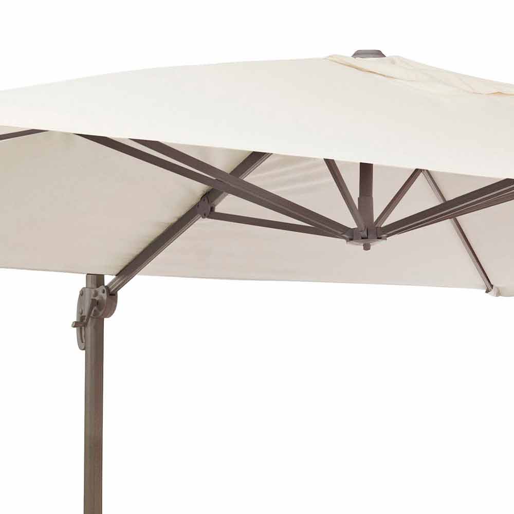 Práškově lakovaná hliníková konstrukce (polyester). Tyč 53x77mm, zavěšená tyč 25x40mm, 8 žeber 14x24mm. Přírodní polyesterová tkanina 200 g / m2 s povlakem pa (polyamid). Křížová základna z oceli . Ručně otočný 360 ° pól.