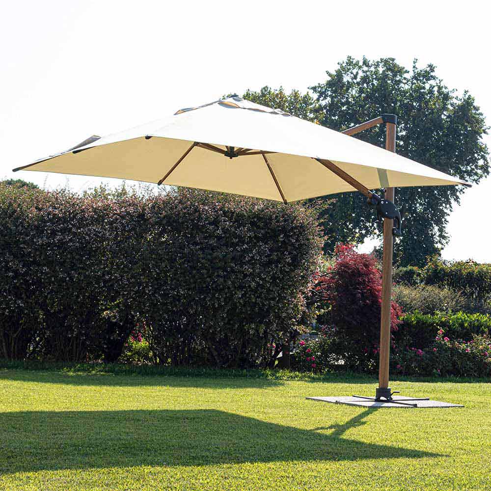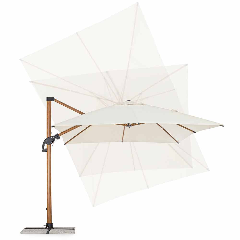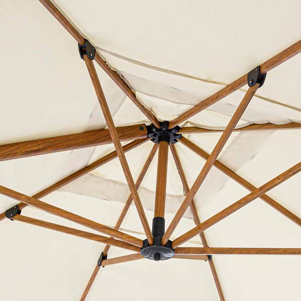 Hliníková konstrukce, práškově lakovaná (polyester) s efektem dřeva. Tyč 90x60mm, 8 žeber 25x17 mm. Béžová polyesterová tkanina 250 gr / m2 s povrchovou úpravou PA (polyamid). Křížová základna z oceli . 360 ° otočná tyč s pedálem. Svislý sklon s 5polohovou rukojetí. Vybaveno sklopným systémem pravo-levého deštníku. Včetně potahu na deštník .