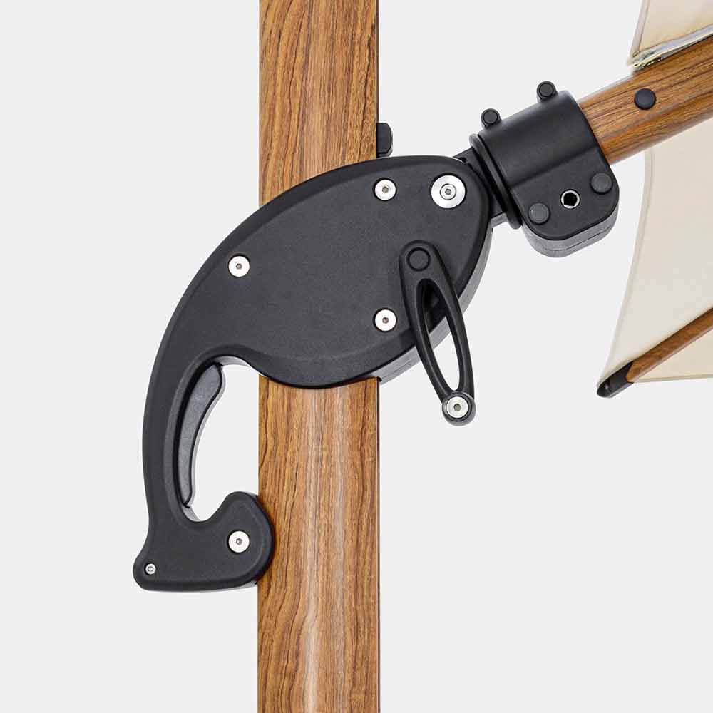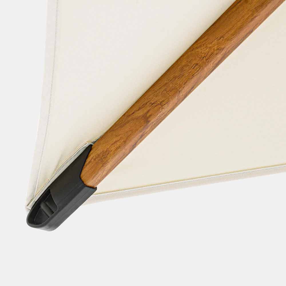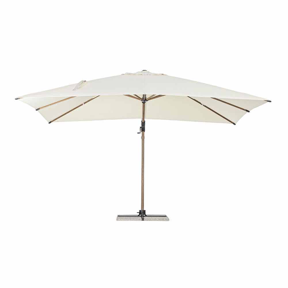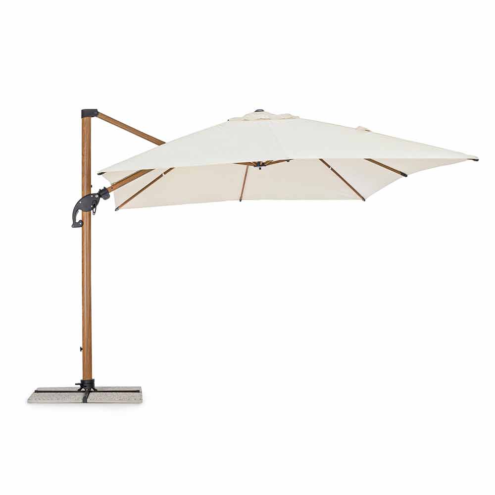 Hliníková konstrukce, práškově lakovaná (polyester) s efektem dřeva. Tyč 90x60mm, 8 žeber 25x17 mm. Béžová polyesterová tkanina 250 gr / m2 s povrchovou úpravou PA (polyamid). Křížová základna z oceli . 360 ° otočná tyč s pedálem. Svislý sklon s 5polohovou rukojetí. Vybaveno sklopným systémem pravo-levého deštníku. Včetně potahu na deštník .