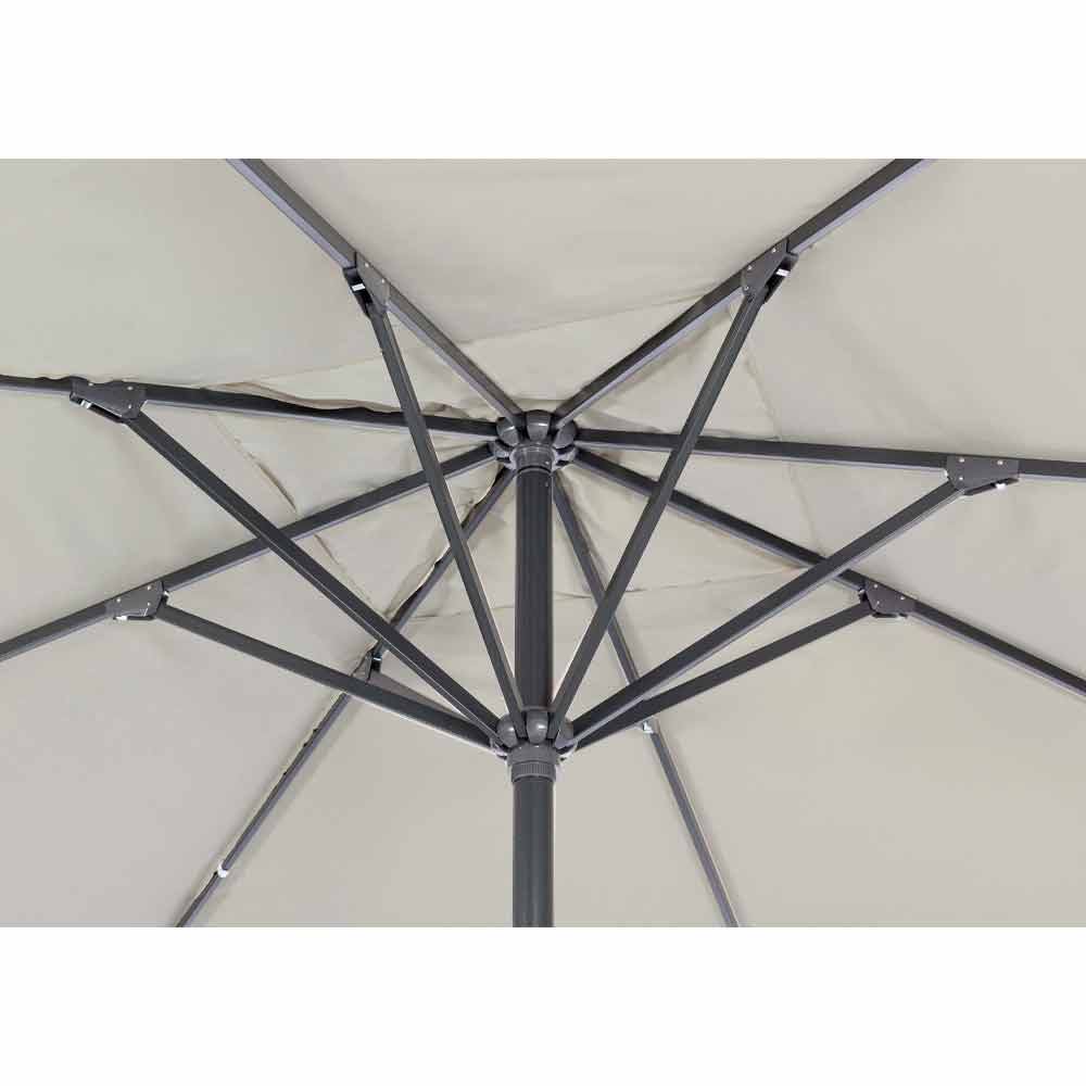 lakovaná hliníková konstrukce (polyester). Pól Ø67 x 2,0 mm, 8 žeber 18 x 30 x 1,2 mm. Světle šedá