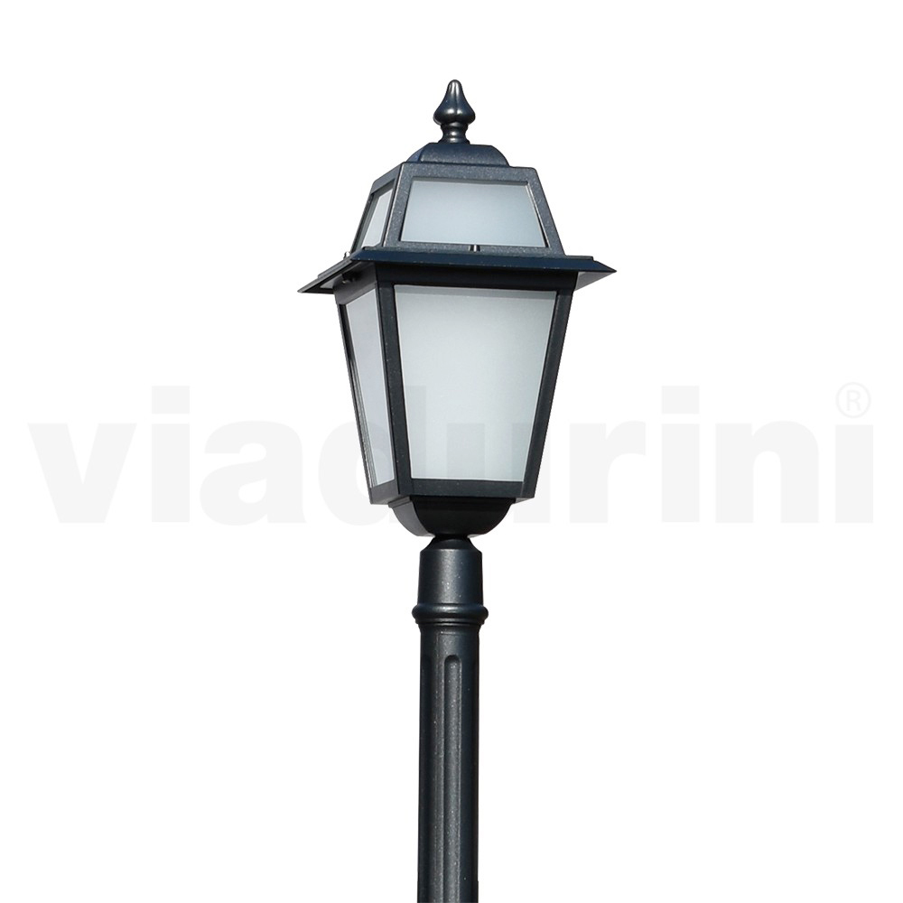 Zahradní lampa vyrobená z tlakově litého hliníku s antracitovou povrchovou úpravou a difuzorem z pískovaného skla , celá vyrobena v Itálii.