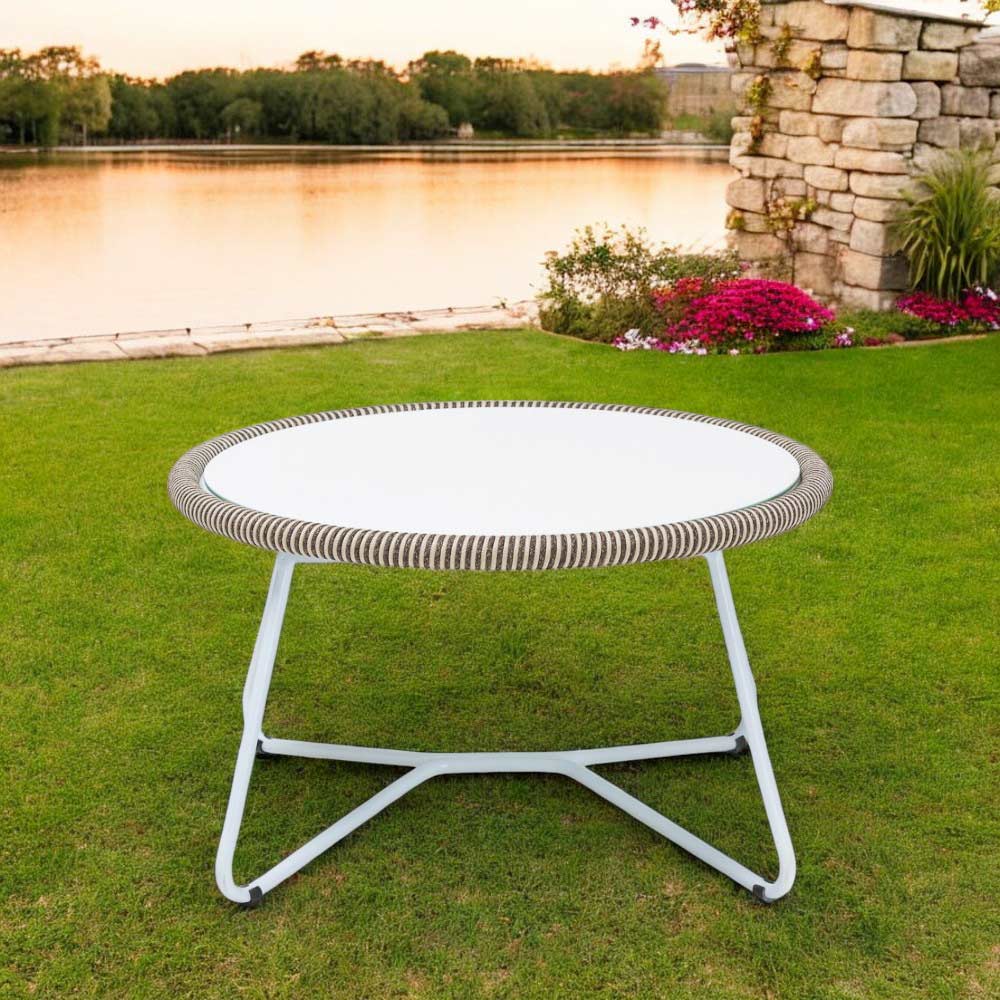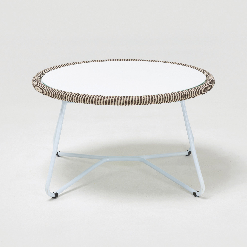 Tento zahradní stolek je ztělesněním setkání designu a funkčnosti v té nejčistší a stylisticky nejvytříbenější podobě. Kulatá horní deska je dovedně protkaná a vytváří sugestivní vizuální efekt, který přitahuje pohled a vybízí k dotyku. Lakovaná hliníková podnož dodává stolu téměř éterickou lehkost a zároveň zajišťuje stabilitu a odolnost vůči venkovním podmínkám.