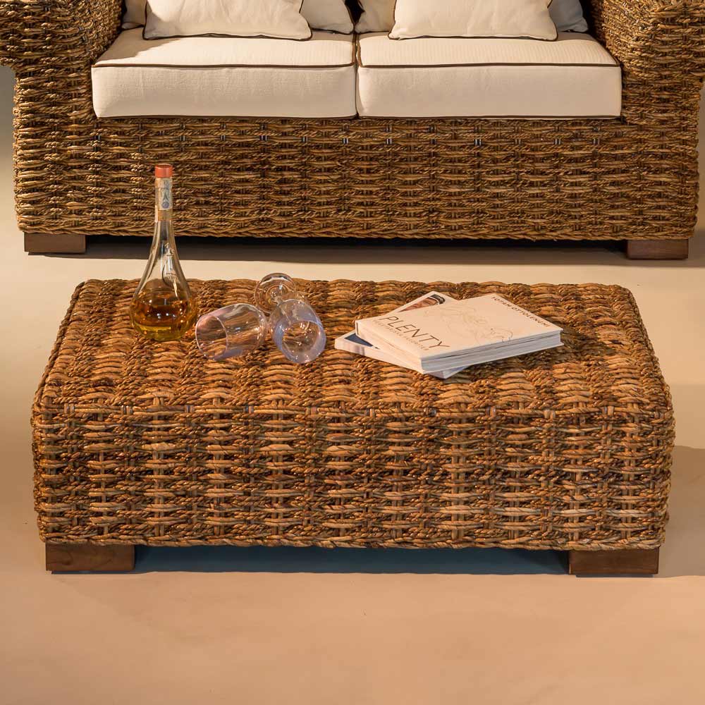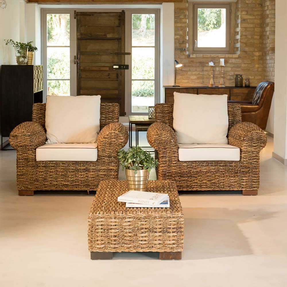 Kávový stolek patří do celé kolekce, kterou činí jedinečnou zaoblené válcové opěrky a rafinovaná hustá vazba z přírodního vlákna abaca, získaného z banánovníku . sedáky jsou velké a jsou vybaveny pohodlnými polštáři .