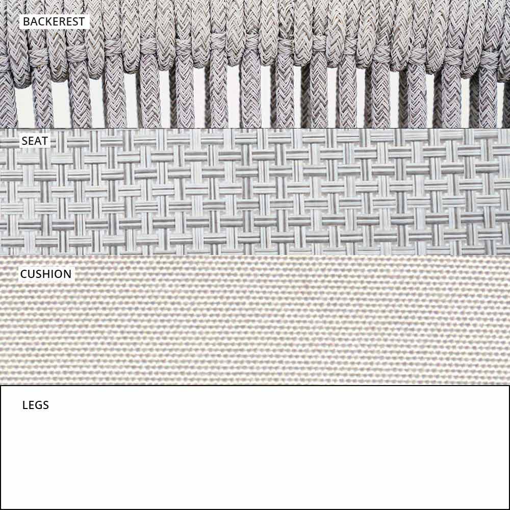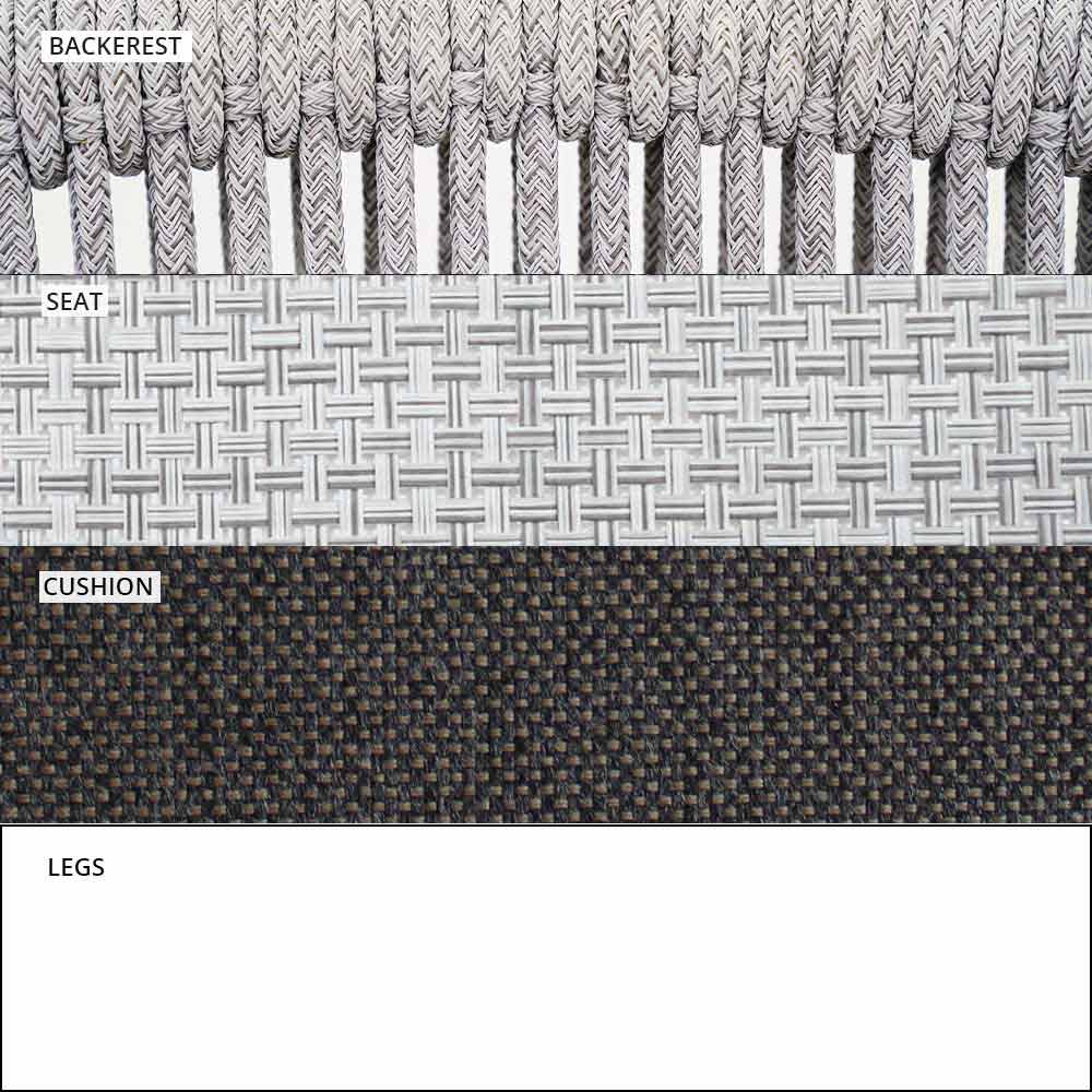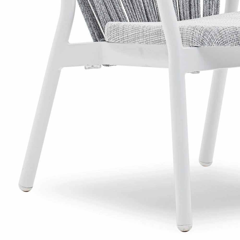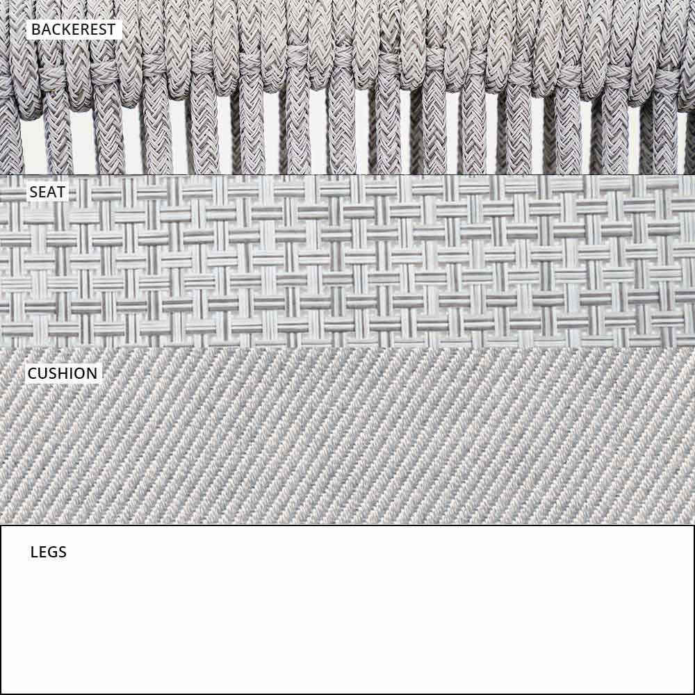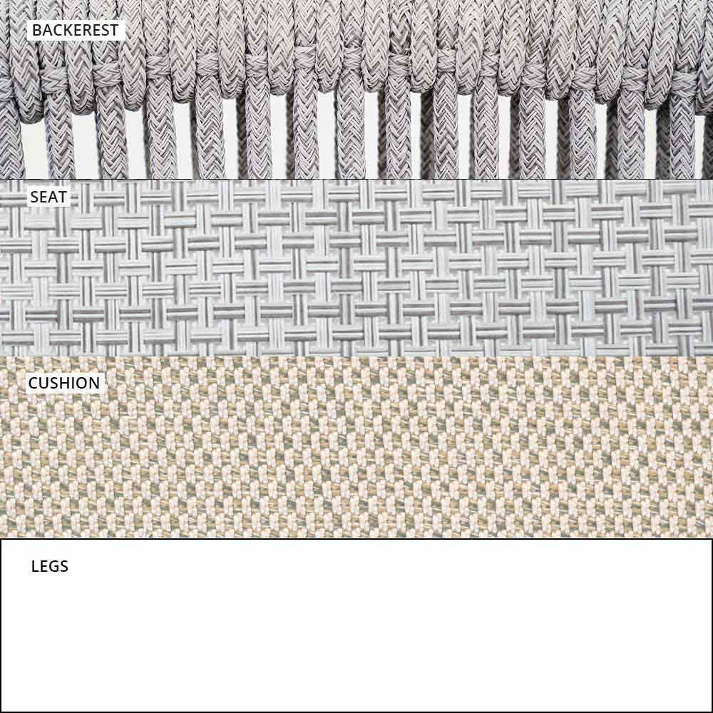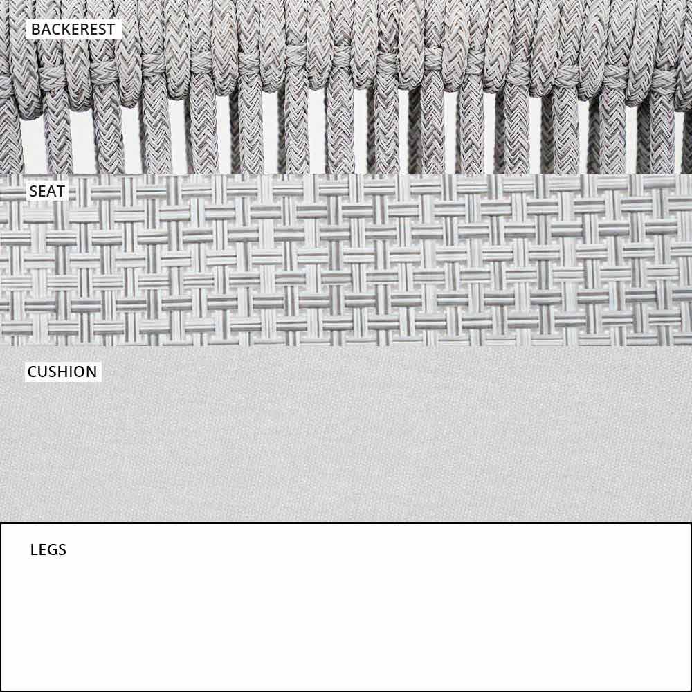 Zakrývací křivka opěradla a štíhlá linie nohou přitahují elegantní siluetu umocněnou harmonickým propletením syntetického lana.