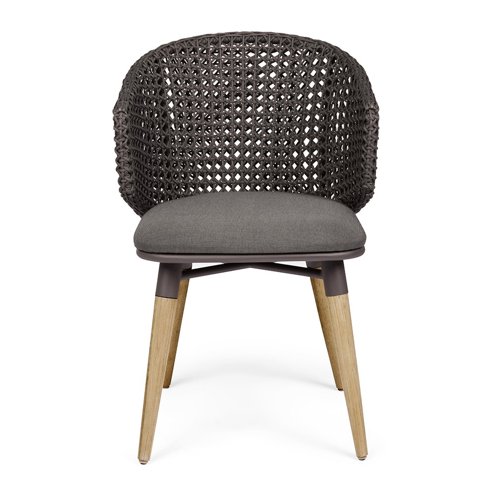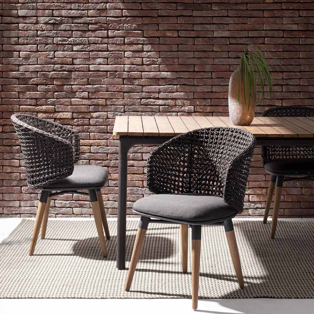 Vysoce kvalitní venkovní křeslo z lana a látky s nohami z teakového dřeva.