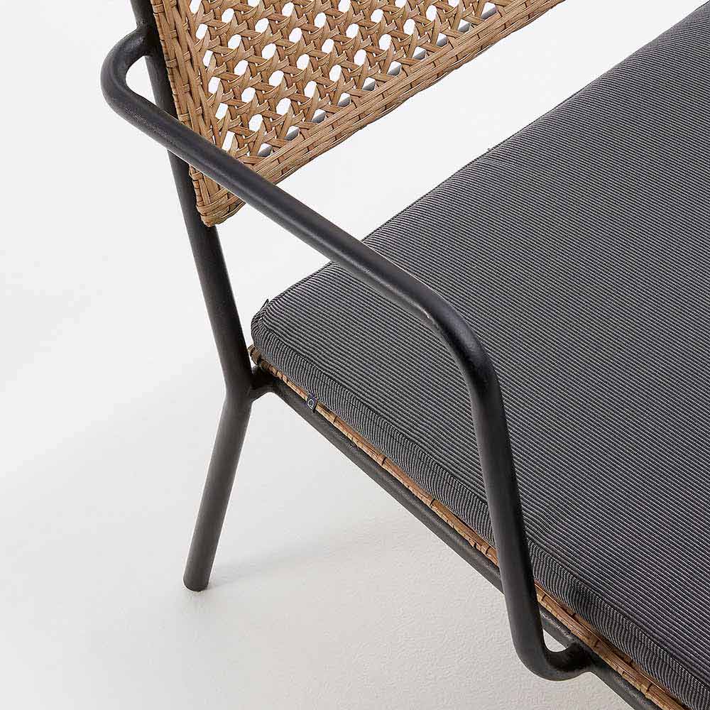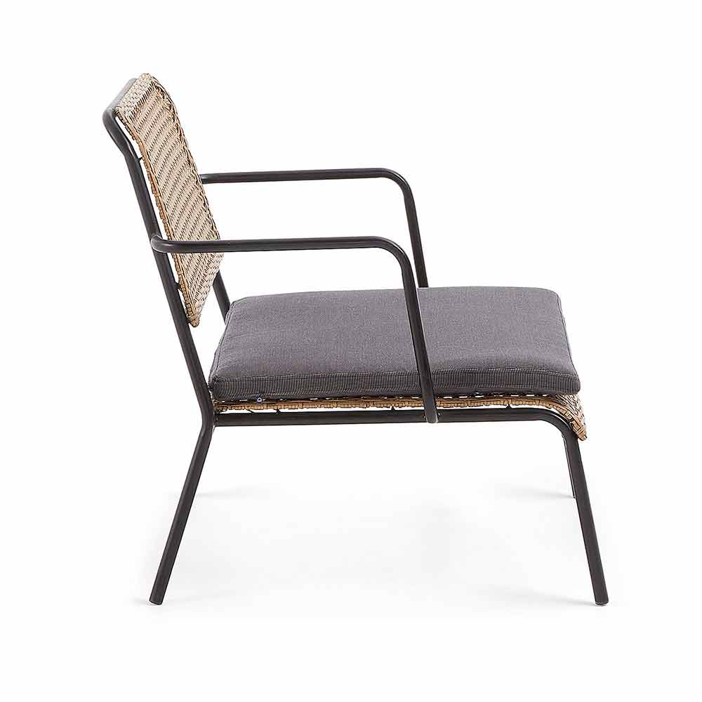 Zahradní křeslo vyrobené z rámu z pozinkované oceli s černým práškovým nástřikem; sedák a opěradlo z béžového tkaného polypropylenu.
